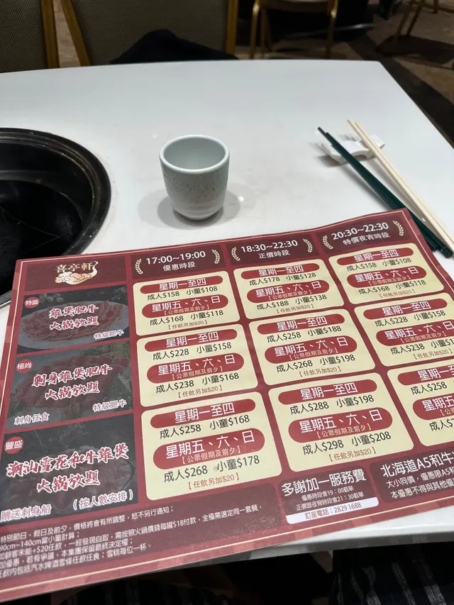 鐘意食潮汕牛嘅新選擇筲箕灣形薈既喜亭軒依家做緊各式各類嘅火鍋放題,最吸引嘅一定係潮汕雪花和牛雞煲火鍋放題因為除咗可以同時食到雞煲同埋刺身之外,仲可以無限任食潮汕雪花和牛!平時出邊一碟都講緊$80起跳但係呢個套餐最平$300就可以任食唔嬲坐定冇耐,職員已經即刻問想食邊一款雞煲,同埋辣度,保證我哋喺最快嘅速度之下已經有嘢食今次我哋揀咗小辣嘅香辣雞煲,雞煲上枱已經香噴噴,keep住煮啲雞都唔會嚡口,絕對拍得住出邊一啲雞煲專門店嘅水準。之後就上咗刺身拼盤,一共有九款刺身選擇,刺身仲可以無限添加,任君選擇。刺身新鮮冇腥味,又係水準以上之作。食完雞煲同刺身拼盤之後就轉咗打邊爐,湯底有接近10種選擇仲可以揀雙拼今次我就揀咗沙嗲湯底同埋花膠豬肚湯底,沙嗲湯底係滿滿嘅潮汕口味配埋鮮牛肉,簡直係一流。而花膠豬肚湯底建議可以先飲一碗先,因為花膠味濃,成個感覺好補。打邊爐嘅選擇非常多,有唔同種類嘅肉(牛,豬,雞,羊),海鮮,丸類,腸仔類,蔬菜,雲吞,餃子,蝦滑,墨魚滑等等。然後我最期待嘅潮汕雪花和牛,終於上台啦,因為係即切嘅緣故,所以大家記得一上台就落order啦潮汕雪花和牛雪花紋理靚,入口軟滑,而且牛肉味濃,非常出色。食完晒之後仲會每人送一盒Movepick做甜品,解解食肉嘅肥膩。如果大家想試靚牛,又想性價比高,又想食得多,又想一次過滿足幾種食物嘅願望,喜亭軒真係一個唔錯嘅選擇。…查看更多