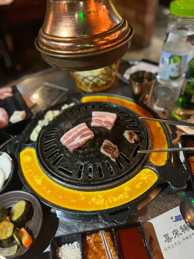 天氣凍左🧤最啱食韓燒可以圍爐取暖💓黎到旺角分店的「喜來稀肉」吾敢講係香港韓燒始祖,但從我中學已經食呢間。一入座店員擺好曬所有配菜,有漬物醃製酸蘿蔔、酸瓜同埋辣味醬大豆芽菜,全部免費🆓添加,解一解油膩感。 掃一掃二維碼就可以下單,所以服務都用自己手提電話📲。烤爐有三格,第一格放微辣泡菜爐邊蛋、一格放拉絲芝士爐邊蛋、最後一格放蒜頭🧄。食韓燒當然要啤啤佢🍻,點少得生米酒(HKD90): 生米酒易入口出曬名,稻米米香清淡,仲加入松葉一陣清香,低溫發酵,搖勻即可飲,口感順滑。護心肉(HKD 158): 沒有醃製過,所以更食得出豬本身原味,食落反而無咩味,要搵生菜🥬包住爐邊蛋同配菜食先調起肉味。韓式烤豬皮(HKD 138): 店家已除去豬毛,好貼心,識食一定烤豬皮,一定要從豬皮個面烤起,微微焦香,油脂四溢,因為油脂多成塊彈起,個時就可以反面燒底面,蘸上綠豆粉減輕負擔感😂食落豬皮脆身,肉身軟糯又吾油膩,食多幾塊都得。牛護心肉(HKD 160):沒有配製,所以牛味更突出,油脂分布好平均,吾會有雪氣,吾錯。牛舌(HKD 148): 用大蒜🧄醬醃製,烤起黎帶點醬汁,薄薄一片各燒五秒好快熟,粉嫩糕粉嫩的,蒜香十足。炒年糕(HKD 75):份量有點細,竟然一隻餃子🥟都分兩半咁煮,年糕係迷你版,吾夠辣,不過不失。總結:食回憶味道 無咩進步坊間仲有其他好食的韓燒…查看更多