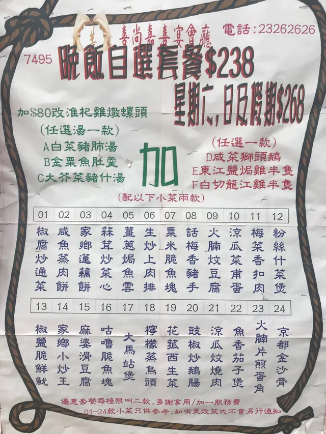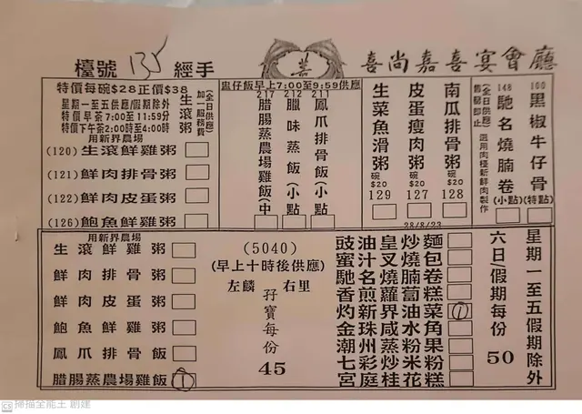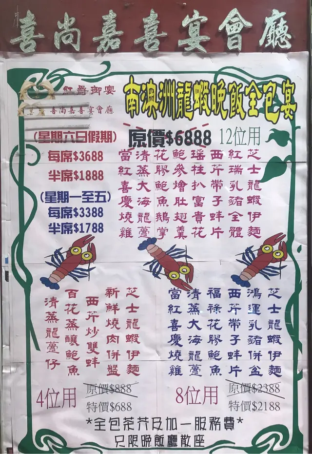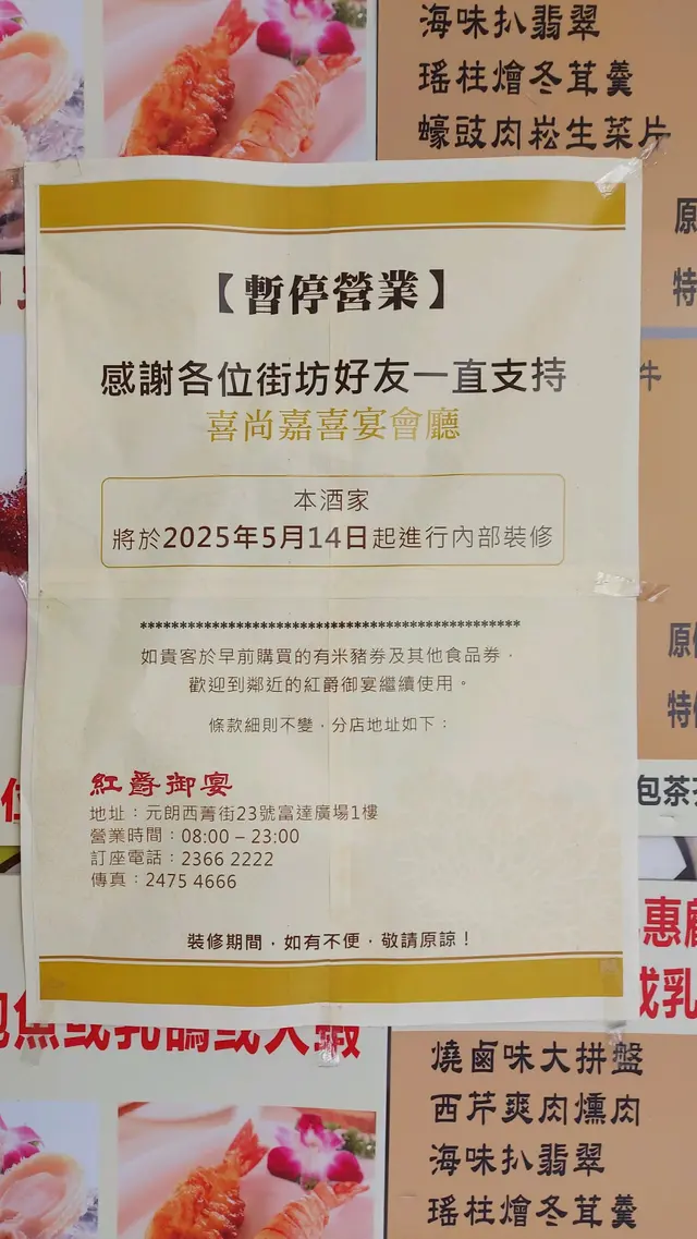 喜尚嘉喜宴會廳 (元朗) 網址: https://s.openrice.com/QrbS0hgy0W0 地址: 香港元朗西菁街10號好順泰大廈1樓 電話: +852 24793003