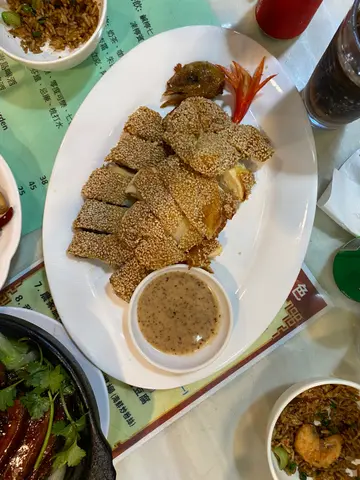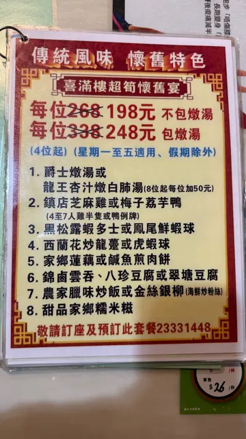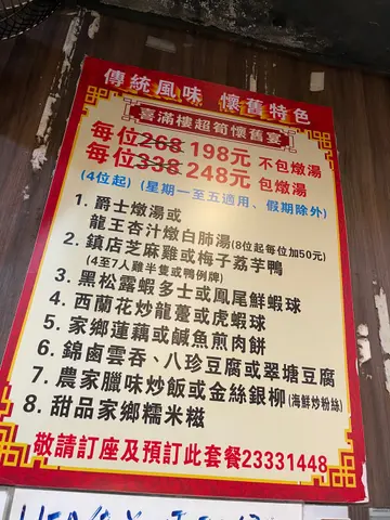 喜滿樓超筍懷舊宴土瓜灣的喜滿樓,把經典手工菜一次過呈現,四至七人共享,懷舊滋味滿滿。//鎮店芝麻雞 — 外皮香脆,芝麻粒帶來堅果香,雞肉嫩滑多汁。//黑松露蝦多士 — 蝦膠彈牙鮮甜,松露幽香滲入,入口先脆後濃。//鳳尾鮮蝦球 — 爽脆彈牙,鮮味乾淨利落。//西蘭花炒龍躉 — 魚肉厚嫩帶膠質感,蔬菜清爽平衡。//鹹魚煎肉餅 — 肉餅扎實多汁,鹹魚香氣濃烈,家常風味十足。//翠塘豆腐 — 豆腐滑嫩如絲,海鮮鮮甜與蔬菜爽脆交織。//金絲銀柳(海鮮炒粉絲) — 粉絲吸滿海鮮湯汁,滑溜鮮香不膩。//家鄉糯米糍 — 軟糯香甜,溫潤收尾。📍 地址:土瓜灣安徽街2號地舖「喜滿樓超筍懷舊宴」每位 198元(不包燉湯) / 248元(包燉湯)。四位起,星期一至四適用,假期除外。敬請訂座及預訂此套餐 23331448 。…查看更多