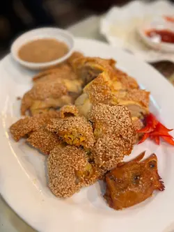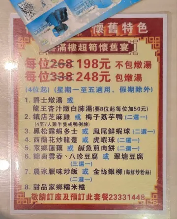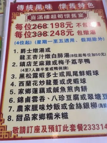 土瓜灣真係臥虎藏龍!呢間菜館主打嗰種香港快要失傳嘅傳統手工菜,聽到都覺得係時候去尋吓寶啦! 今次我哋就去試咗佢哋個招牌套餐—「喜滿樓超筍懷舊宴」成個套餐有八道菜,真係食到你捧住個肚走! 爵士燉湯 (包燉湯版限定): 未飲已經聞到陣陣香味。用料非常特别,竟然係用日本蜜瓜去燉煮,仲有雞腳、螺頭、金華火腿同豬展,味道十分清甜 客家蓮藕煎肉餅: 肉餅煎得香口,加埋蓮藕粒增加咗脆口嘅口感 黑松露蝦多士 / 鳳尾鮮蝦球 : 我哋揀咗每樣兩件!餡料真係好飽滿,食到粒粒蝦仁,多士夠哂脆口,仲有淡淡嘅黑松露香,邪惡但係值回票價! 鎮店芝麻雞: 招牌菜!雞皮用芝麻包住,燒到脆卜卜,咬落去有爆芝麻香,雞肉嫩滑,點埋芝麻醬更惹味 西蘭花炒龍躉: 呢個夠哂鑊氣!龍躉肉厚又滑,西蘭花爽脆,有傳統酒樓小炒嘅水準 錦鹵雲吞: 呢個真係好懷舊!酸酸甜甜嘅醬汁,入面仲有鮮魷、豬潤、蝦仁等配料,撈埋炸到脹卜卜嘅雲吞,酸甜開胃 農家臘味炒飯: 炒飯粒粒分明,臘味香氣十足,夠晒地道風味 家鄉糯米糍: 口感煙煙韌韌,有紅豆同芝麻口味,甜度剛剛好 用 $200 零蚊 就可以食到八道咁有心機、有傳統風味嘅手工菜,真係超值!成餐飯都感受到菜館對傳統風味嘅堅持,絕對唔會令你失望! $198/位 (唔包燉湯) 或者 $248/位 (包燉湯),四位起,係星期一至四限定…查看更多
