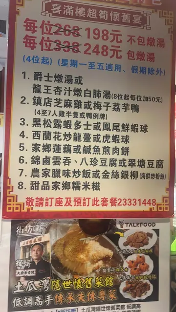【喜滿樓晚市食評】土瓜灣喜滿樓晚市六位套餐整體味道正常,但個別菜式表現參差爵士湯湯頭濃郁香甜,用料足,火候到位,屬當晚較出色的一道。芝麻雞(招牌菜)芝麻香氣突出,表皮香脆,但雞肉偏老,口感稍韌,作為招牌菜略顯遜色,期望更高。蓮藕餅(臘腸碎)蓮藕餅外脆內軟,臘腸碎增添風味,口感豐富,味道不錯。蝦多士炸得金黃酥脆,蝦膠彈牙,油控得宜,不過無特別驚喜。炸蝦球 &翠塘豆腐蝦球大隻爽口,豆腐內嫩,調味適中,底部有蒸水蛋,兩者搭配平衡。臘味炒飯炒飯乾身夠鑊氣,臘味香濃,但略嫌油份稍多,整體仍算合格。總結套餐整體水準中規中矩,惟招牌芝麻雞未達預期,肉質老化問題較明顯。其他菜式無大瑕疵,但未見突出。適合家庭聚餐,但對招牌菜不宜過高期待。…查看更多
