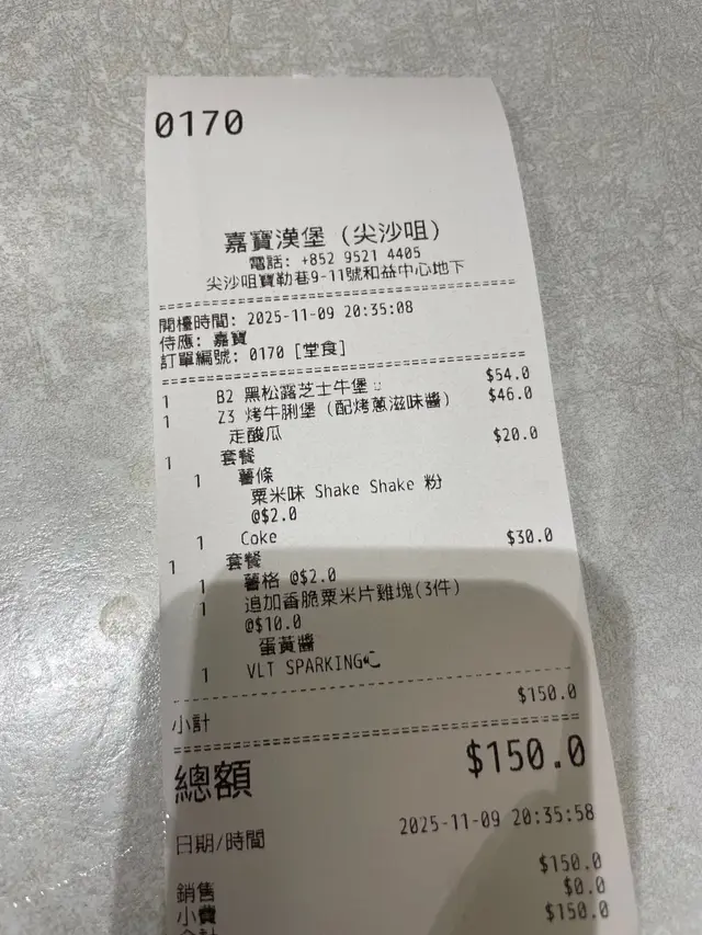 嘉寶漢堡 (和益中心) (尖沙咀) 網址: https://s.openrice.com/QrbS0P9y500 地址: 香港尖沙咀寶勒巷9-11號和益中心地舖 電話: +852 95214405