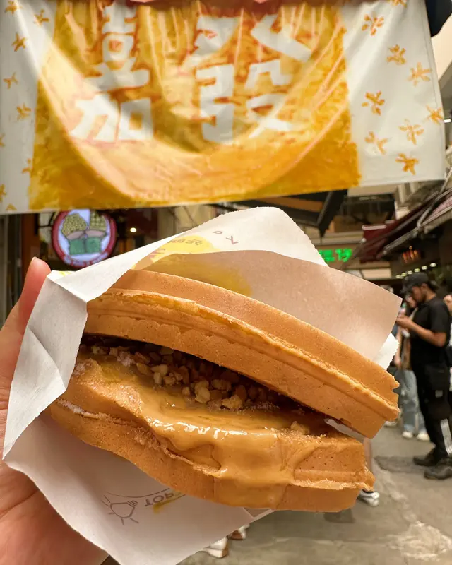 嘉發小食🧇 街頭的幸福滋味美食係值得等待嘅,第一次試呢間排隊小食店,格仔餅雞蛋仔通通即叫即製,新鮮熱辣出爐,外脆內軟,蛋香濃郁。花生醬🥜格仔餅🧇😋😋😋😋😋格仔餅可以選擇餅底厚底或者薄底,今次試咗花生醬厚格仔餅。我一早做定功課,要水平拎住咁食,如果唔係,中間滿滿的花生醬,一定流到成身都係😂。因為格仔餅真係太厚啦,想一啖食晒都唔係咁容易。揀厚底格仔餅,果然冇錯,厚餅底脆得來又不失鬆軟,蛋香,牛油香加埋花生醬仲有花生粒粒,完美組合。繽紛樂格仔餅,開心果醬格仔餅同豬柳蛋雞蛋仔都係十分之出名。雖然要排隊,但都值得等。🥰查看更多