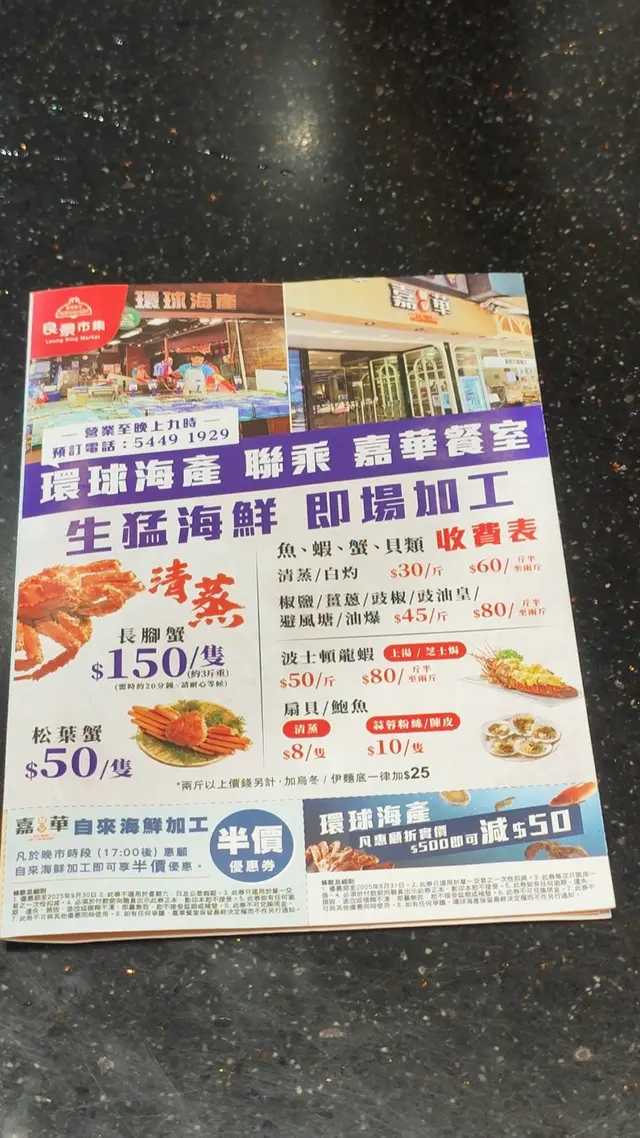 今次去咗良景市集環球海產自己揀海鮮,再帶去隔離嘉華餐室加工,方便又新鮮!流程好簡單,先係市集揀靚海鮮,款式多到唔駛驚揀唔到心水,揀完即刻拎去嘉華餐室加工,價錢好親民。今次試咗幾款: ✅陳皮蒸鮑魚($50/6隻)+加工$60=$110,鮑魚蒸到入口柔軟,陳皮香微甘,好開胃; ✅豉椒炒沙蜆($36/斤)+加工$45=$81,豉椒味濃,沙蜆鮮甜彈牙,好吸引; ✅芝士焗波士頓龍蝦2隻($158隻)+加工$80/斤+米粉底$25=$421,龍蝦肉厚彈牙,芝士香濃creamy,米粉底又有另一番享受; ✅白灼大頭蝦($98/斤)+加工$30=$128,蝦肉嫩滑鮮甜,好正。餐室環境乾淨舒服,加工價錢合理,唔想自己煮又想食靚海鮮,以後可以過嚟唔洗煩查看更多