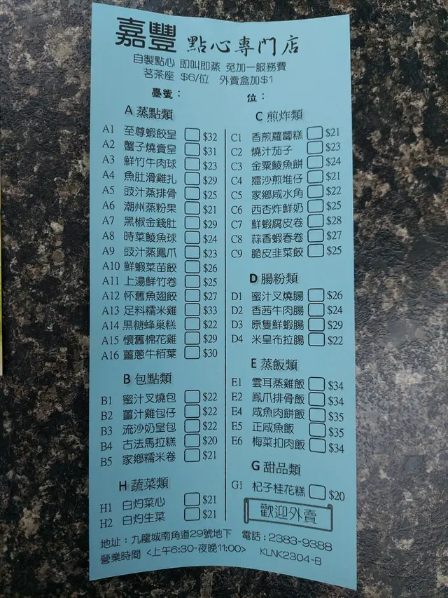 嘉豐點心專門店 (九龍城) 網址: https://s.openrice.com/QrbS03lm000 地址: 香港九龍城啟德啟德道19號地舖 電話: +852 23821298