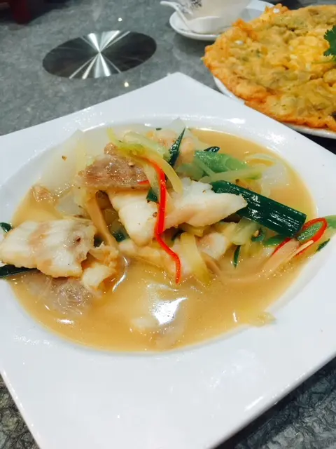 已經唔止一次黎食午餐, 凡親要食送別飯多數都黎呢度, 坐得幾舒服之餘又有電視睇!見到佢有午市套餐, 係多款小菜菜式中可以選3/4/5款, 另配老火湯!  我地今次就點左3款:咸菜蘿蔔煮龍躉片 - 加入少少黑椒調味, 有少少似咸菜豬肚湯d friend, 但無咁咸及辣!  咸菜食落夠腍及唔會過咸; 反而蘿蔔就帶硬身, 無咁腍甜; 龍躉片都幾厚肉, 食起黎夠晒口感, 份量多返D會仲好!煎蠔烙 - 一客份量都唔少, 煎得金黄色幾吸引, 配以魚露/胡椒粉調味, 食落邊口夠香脆, 中間部份幾煙韌, 蠔仔味偏淡但味道係唔錯!粉絲海鮮煲 - 以石頭鍋上能保持熱度, 但食到尾D粉絲會變成"粉絲焦", 歡喜食脆口野就會幾欣賞!  海鮮方面有帶子, 蝦, 魷魚及魚塊, 乾身得黎味道幾惹味! 查看更多
