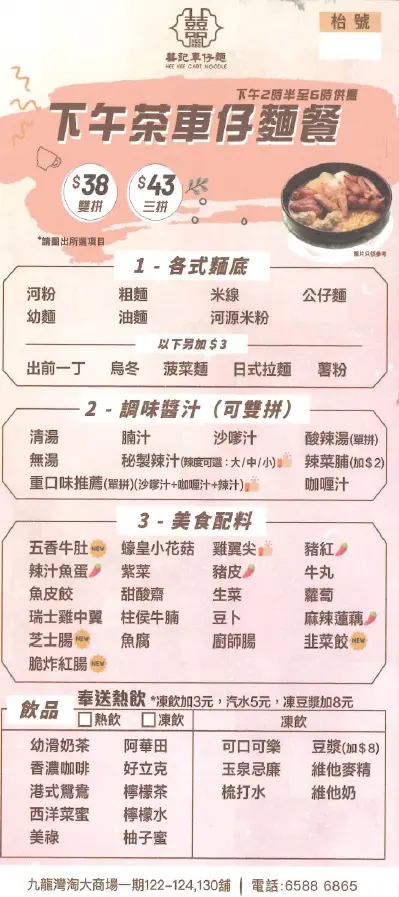 囍記車仔麵 (九龍灣) 網址: https://s.openrice.com/QrbS0xVC800 地址: 香港九龍灣牛頭角道77號淘大商場1期地下G122-124 & 130號舖 電話: +852 65886865