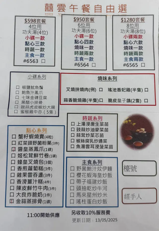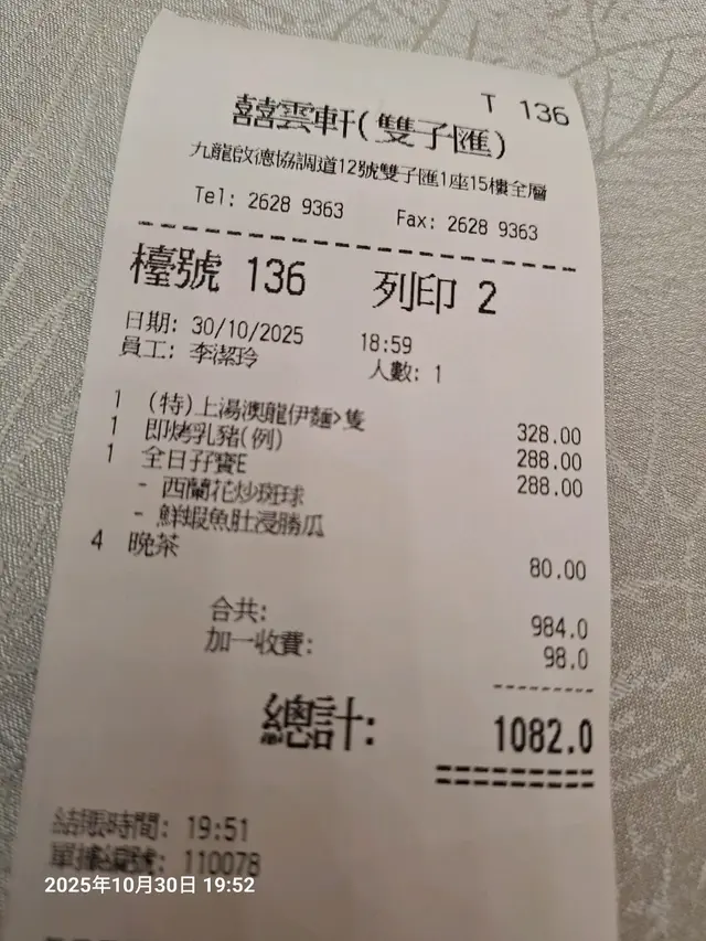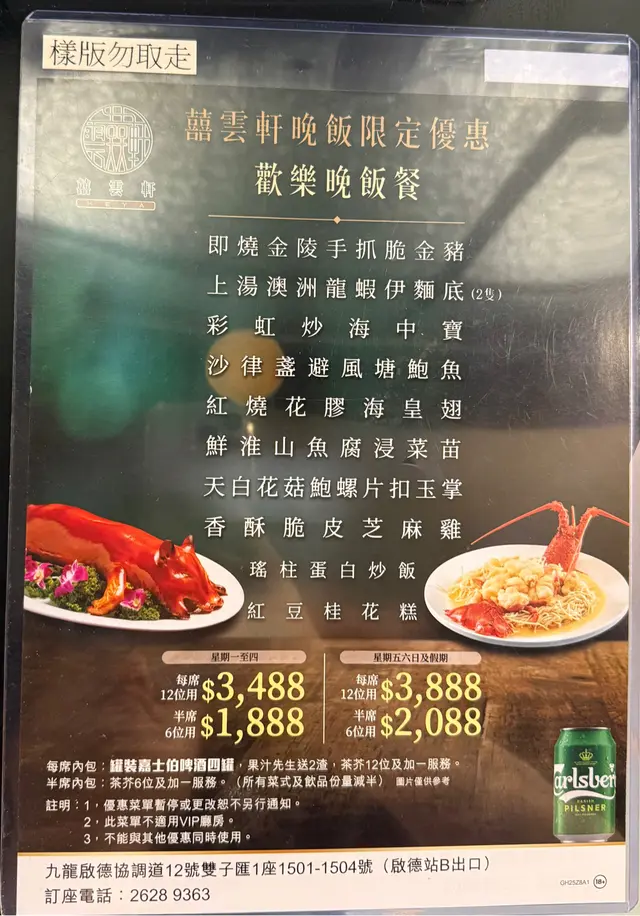 囍雲軒 (雙子匯1期) (九龍城) 網址: https://s.openrice.com/QrbS0teGD00 地址: 香港九龍城啟德協調道12號雙子匯1期崇光啟德店食匯堂15樓 電話: +852 26289363