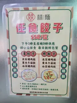任食餃子🥟$58/位星期一、星期三、星期五、星期日😊每日限人數名額70名😌下午3時至夜晚9時供應,40分鐘任食😍另外奉送一杯冷/熱飲品/一罐汽水🥤請勿浪費,食剩每隻收$5😆真係睇住新鮮即時包製☺️有煎餃子同湯餃子😆韭菜豬肉餃,粟米冬菇餃,白菜豬肉餃🥟我大概排咗半個鐘頭左右😌入到去即刻落單😂老闆教我每樣五件,一共30件😊落單個刻計時,15:55🤓15:57,已經有15件湯餃子🙃又估唔到咁快喎☺️湯餃,我比較鍾意粟米冬菇餃🤭16:02,嚟埋15件煎餃子😇的確比我預計真係快好多😎煎餃,我比較鍾意韭菜豬肉餃😆好快俾我輕鬆KO😏16:07,已經2nd Order多20件☺️16:15,全部到齊😌16:20,已經埋單走埋,總數50件😆整體餃子都係大件,味道都OK嘅🤭呢個價錢包埋飲品🤓都真係幾抵👍囍麵 (長沙灣)長沙灣福華街586號地舖查看更多