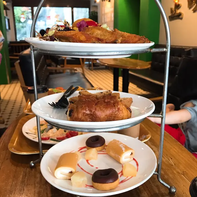 經常都會去呢間,因為近!同區少有呢類可以「坐」嘅地方。可以扮下偽文青,坐下傾下計,坐幾耐都冇人理!今次叫皇室三層架,再加個忌廉汁鮮蝦扁意粉。2個大人加2個小朋友。份量都夠。忌廉鮮蝦意粉有驚喜,忌廉汁夠香濃,鮮蝦大隻又爽口。意粉軟硬適中。唔錯!皇室三層架就令人有少少失望,只有個炸雞翼值得讚,炸得夠香脆又唔覺油賺,又夠入味!但啲甜品就越嚟越hea.... 蛋捲又乾又硬!冬甩又係乾爭爭!中間果層仲hea! 個朱古力卷酥唔夠酥。好酥...最正係杯咖啡! 紙杯蓋又唔吸實!一拎起倒晒...淡而冇味。唔知飲緊乜