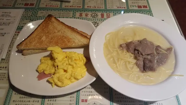 到茶餐廳,大部分時間我都會點常餐。這裡的炒蛋做的不錯,挺嫩滑的。厚多士可轉排飽,多士塗滿牛油,但略嫌多士不夠鬆軟,有點過硬。麵食方面,另有牛肉、豬排、叉燒可選,我這個是鮑魚絲蘑菇。鮑魚絲和蘑菇份量都很多。湯底可選蕃茄湯或忌廉湯,蕃茄湯酸酸甜甜的很不錯。但友人的忌廉湯則跟一般湯底沒什麼差別。查看更多