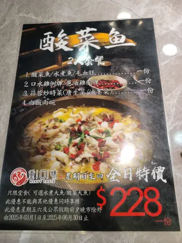 今日好想食酸菜魚就即刻搵個都鍾意食嘅朋友一齊去食,朋友介紹呢間酸菜魚好食,咁我哋就選擇去呢間食,我哋大約晚上7:00去食,唔駛排隊,一入到去店員就叫我哋隨便坐,我哋食到差唔多一半嘅時候,啲人開始陸續嚟食,幾乎坐滿人咁滯,好彩我哋早去食,如果再晏啲可能就要排隊,店員服務態度都好好,我哋問佢邊隻酸菜魚好食,佢就好詳細介紹我哋食鱸魚或者桂花魚,我哋聽完佢意見,就選擇食鱸魚,叫左少辣,同埋咸肉菜花,整體兩味餸都好食,我同朋友食得好滿意。…查看更多