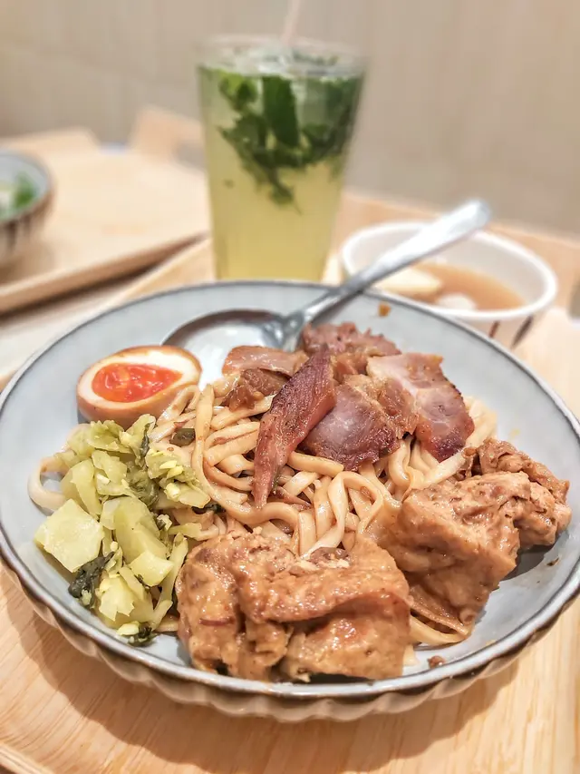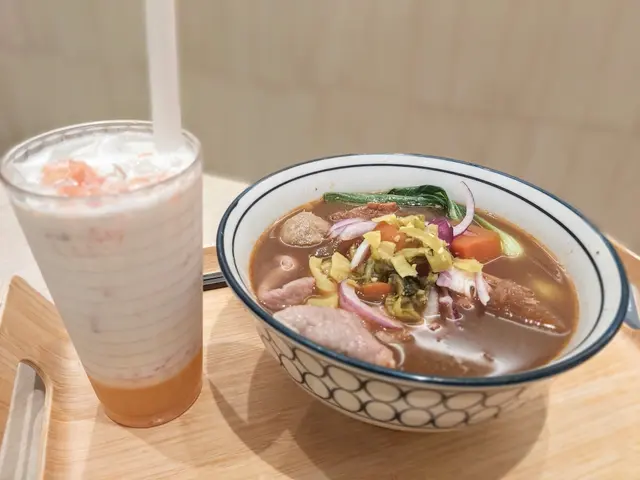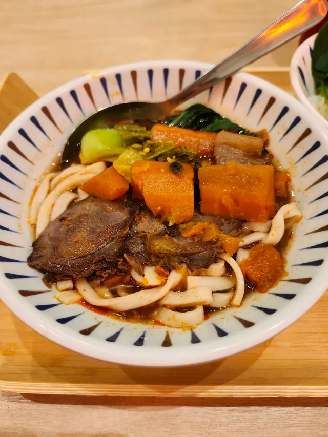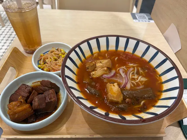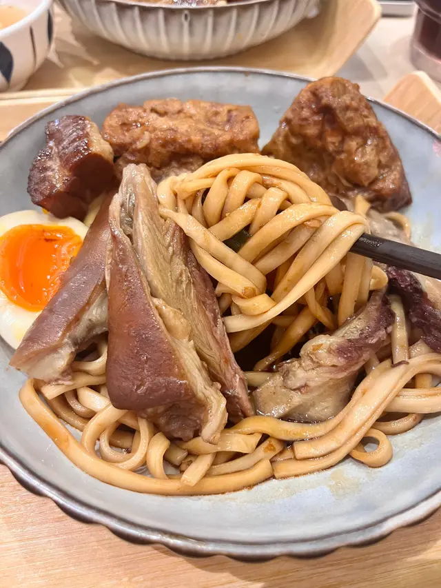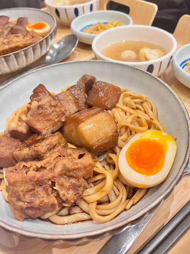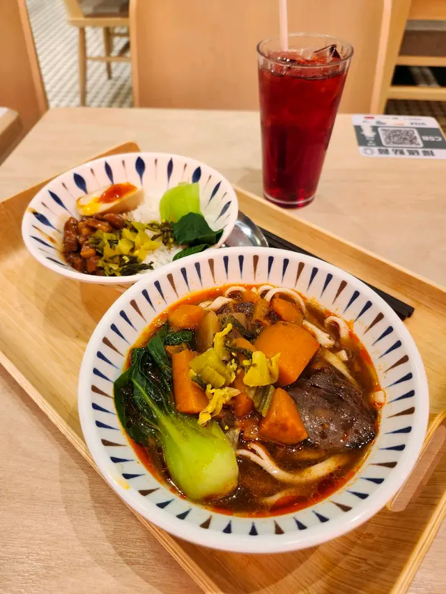 #20250329 🤍📍 #四湯八麵 @soups_meens 觀塘觀塘道418號創紀之城五期(apm)4樓L4-18號舖➖➖➖➖➖➖➖➖➖➖➖➖➖➖➖➖➖#古早藥膳紅燒肉麵 #手工幼麵 $68💭 間野個名有湯有麵,第一次尼食就梗係試左個湯先,藥膳湯飲落真係帶啲藥材味,不過甜味居多,算係易入口,未計主菜已經有啲豆卜、蟲草花、豬肉丸同札肉係個湯度都幾豐富,紅燒肉係蜜汁版既五花腩,係幾好味🤤幼麵咬落煙韌,有啲似韓式公仔麵再有咬口啲,果然無負佢個名呀👍🏼.#番茄麻辣阿嫲無骨豬手麵 #手工闊麵 $68💭 其實佢啲主菜尼尼去去都係果幾款,主要係揀左個湯底先,個湯本身又係有啲餸係入面,麻辣湯就跟鴨血同豆腐,佢啲鴨血唔係一片片而係一條條好得意,可以一野吮入口😂豬手皮非常之淋,不過同時帶啲漏,唔食得太多,啲肉又有啲鞋同痴牙,麻麻地😅個麵雖然叫闊麵但唔係刀削麵果隻闊,但口感同樣煙韌,係好味既!. 🥢 #季節涼菜 🥢 #烏龍茶 💭 晏晝叫所有麵都會跟個前菜同野飲,今次個前菜係涼拌大豆芽,好有韓國既風味,野飲有三款茶揀都唔使加錢,下次尼可以試埋個拌麵先~.#觀塘美食 #🐷在觀塘 #🐷_食 …查看更多