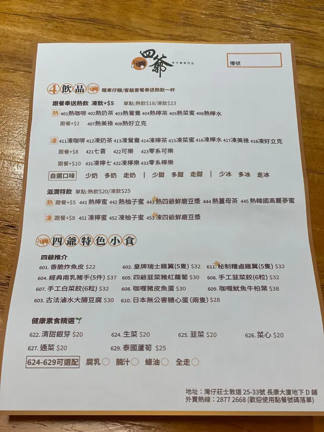 四爺車仔麵專門店 (灣仔) 網址: https://s.openrice.com/QrbS0sW4900 地址: 香港灣仔莊士敦道25-33號長康大廈地舖 電話: +852 28772668