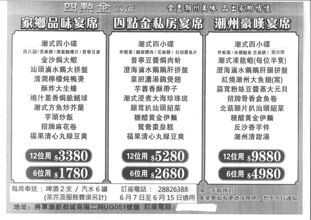 詫異早兩個禮拜先去咗,不過諗吓諗吓都係想寫呢一個意見,平時有嚟幫襯開啲小菜覺得唔錯,價錢實惠,環境OK,今次諗住食好啲,可以嗌個潮州翅套餐收我兩位千三真係令我食到㷫;成個套餐出嚟嘅dishes 極度Hea:金華火腿浸時菜比四條娃娃菜我(最平嗰隻)亂咁煮,擺盤又核突,滷水鵝不見特別出色,冰鎮鮑魚求其罐頭兩隻擺出嚟,冇技巧可言,仲有一兩碟小菜食完都唔記得係咩;最攞膽係我最期待嘅兩碗翅,個味道仲衰過我出邊街邊食兩碗碗仔翅,咸到想死! 食完高血壓都嚟,成個套餐冇賣相,嘢食難食用cheap了,完全唔合理價格,complain完個喊到死嘅次,佢話送多啲甜品俾我,點知嗰碟送嘅蛋散偷工減料少過人哋隔籬枱成三份一,仲要呢個本來係我首選嘅甜品,好心你啦。做得好好睇睇唔得嘅!真係識唔識做生意㗎?半個月前食完諗吓諗吓都係谷住導氣嘅過嚟寫返個comment點知竟然見到佢執咗笠,而家明白點解🥲😂…查看更多
