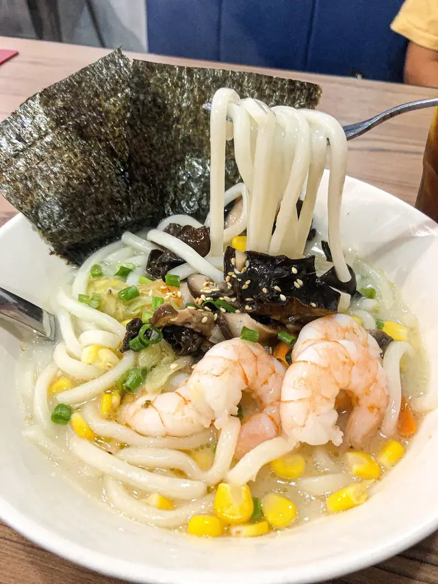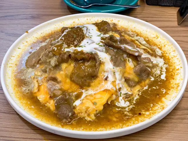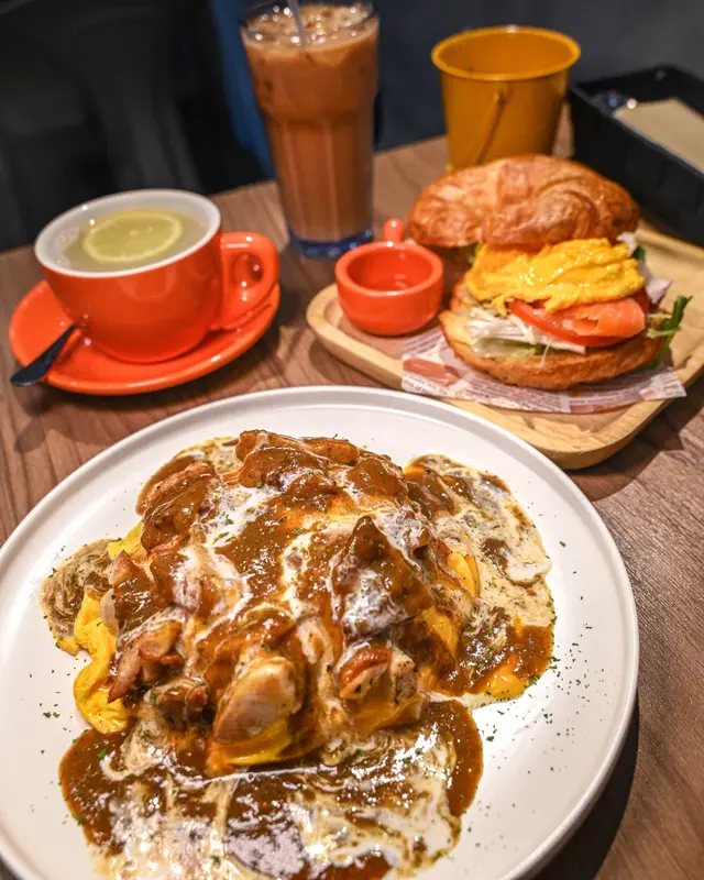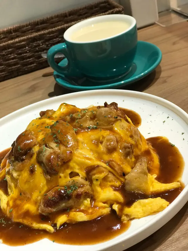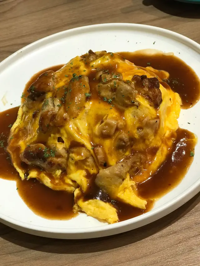 。原本佢地有個冷烏冬都想食,不過落雨又淋濕晒有點涷,就叫左熱野滑蛋包飯系列