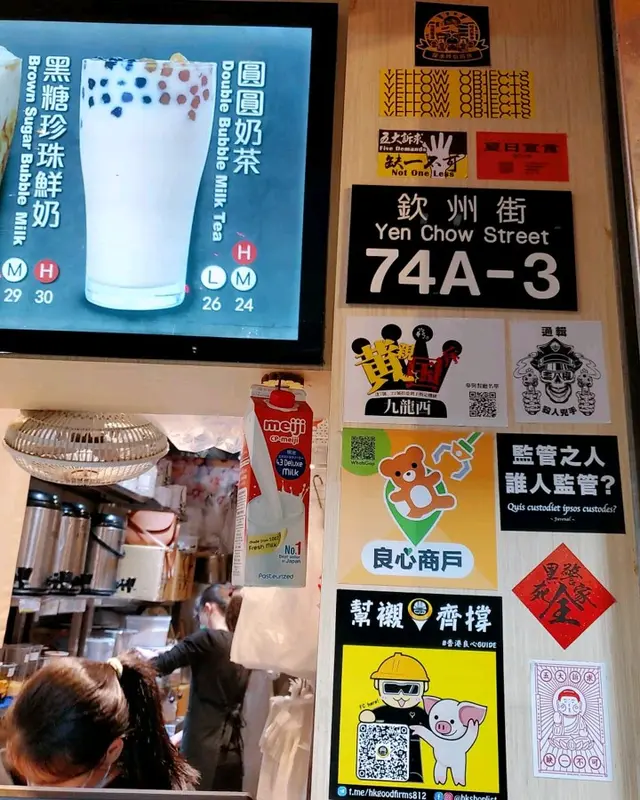 前牌潮流飲黑糖珍珠鮮奶,而依間位於西九龍中心對面嘅台飲店見好多人ig都話係好飲排名好前嘅珍奶🤔店主係台灣人,表示堅持不用香精和奶精,而且仲用咗蔗糖!我係閒日夜晚8點鐘左右去幫襯,估唔到都有好多人去幫襯有條小隊仔等拎飲品,不過由落單到拎飲品大約10分鐘係可以接受。⭐️學生可以減兩蚊⭐️12點前各款配料+$1💛黃店認證:5.8、11.11響應罷工,門面貼上黑警死全家、連豬圖案等祝福貼。👓 黑糖珍珠鮮奶 M $29冇叫少甜, 因為飲品冇加糖漿而甜味來自珍珠的黑糖,如果叫少甜會落少黑糖冇咁濃郁🙋🏻‍♀️但我覺得正常甜度都唔算太甜剛好。採用日本明治鮮奶夠厚滑,不過奶味唔算非常重突顯唔到黑糖鮮奶嗰種精粹🤧珍珠反而做得幾出色,黑糖珍珠熬煮兩小時,果然一咬好強烈嘅黑糖味,唔係一味死甜;珍珠彈牙好煙韌幾好。💁🏻‍♀️ 依間黑糖珍奶比例剛好適合本身唔太鍾意黑糖珍奶嘅人,黑糖味唔算超多超滯(李圓圓係成杯都重黑糖漿而依間係主要珍珠有黑糖,同李圓圓相比依間奶味冇咁厚和重)💁🏻‍♀️➡️圓圓適合一啲唔太大熱愛黑糖珍奶嘅人💁🏻‍♀️➡️李圓圓適合鍾意黑糖同重鮮奶味嘅人評分:8/10👓 圓圓珍珠奶綠 M $24叫咗半糖甜度剛好🙋🏻‍♀️綠茶好出感覺清新。圓圓系列有雙色珍珠分別黑糖珍珠和黃金珍珠:珍珠同樣做得好出色,即使唔係刻意叫黑糖但一咬落去都有好香嘅黑糖味;而黃金珍珠以蔗糖熬煮,少少甜而不膩,變相唔使剩係得一款黑糖珍珠咁漏咁單調。評分:8/10👓 圓圓珍珠炭焙烏龍茶 L $24叫咗微糖但有甜味而甜度剛好🙋🏻‍♀️烏龍茶味好出好明顯,有點烏龍茶嘅甘味,可能就係所謂嘅炭焙香🤣如果嫌鮮奶或奶茶會太膩可以考慮烏龍茶。評分:8/10查看更多