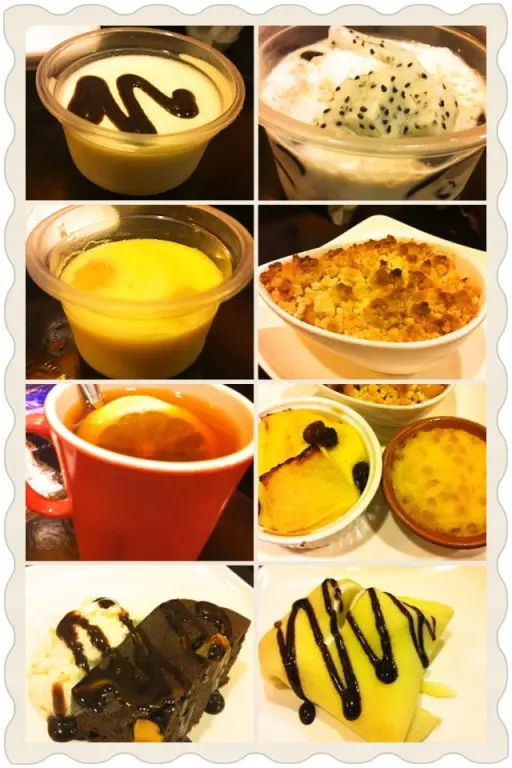 自助很值 可是味道總體一般 一個來自上海的吃貨等級42012-02-03195 瀏覽 關注 事先怕下午沒味所以前一天提早致電預約了結果今天去了發現店內顧客甚少 有種包場的感覺 O(∩_∩)O哈哈~店員也只有老闆娘一人 好在顧客不多 甜品放題的也只有我和朋友二人 也沒有被怠慢的感覺 老闆娘很親切來店內的裝修也跟外部互相映照 溫暖的橘色 亮麗的黃色 舒服的綠色 再加上不是那麼刺眼的溫暖黃光 整個空間顯得很是溫馨入座后環顧四周 最吸引人的是通往廚房的那條《超長》走道!正面走道墻被刷成超溫暖的黃色調調 看得人很舒服 牆上兩條長長的拍立得相紙成為店內最好的裝飾即是店鋪受歡迎的佐證 又很時尚的佈置了店內的牆面 一石二鳥~相片中的人可以說是老中青 各個年齡都有 各個關係的人群也有 有三口之家的 也有四代同堂的 有兩小口子甜蜜的 也有一大群“狐朋狗友”擠熱鬧的!開吃啦!第一輪上的比較快 因為都是從門口的雪櫃里直接拿出來的凍品~藍莓芝士蛋糕紐約芝士蛋糕芝士蛋糕個頭雖很迷你 (完全能夠理解做放題生意的店家)味道卻不賴!冷芝士味濃郁卻不膩 芝士層非常之厚配上薄薄的底層蛋糕軟潤適中 店家用料實在紐約芝士最為純正 每一口都是純純的芝士味 非常滿足 芝士也凍得比較厚實 挖的時候完全不會塌下去 在口中慢慢品嘗也有頗有“嚼感” 藍莓芝士亮點絕對在于上面的藍莓果醬了 可以看到三分之二的部份都鋪上一層厚厚的藍莓醬!看得很是喜人藍莓醬的顏色有些偏暗淡裏面夾有不少的藍莓肉吃起來藍莓味不是很濃 化而言之沒有新鮮藍莓特有的酸甜口感所以就口感而言 這款《藍莓》芝士還是更偏重於普通的芝士蛋糕 更多的是甜蜜豐富的芝士味 而非藍莓!奶凍放在倒梯形的塑料容器中很是小巧玲瓏 從上面看“波平如鏡” 呈現淡淡的雞蛋黃色澤凍得也十分結實 吃的時候不會因為挖走一塊少了力的支持而整個塌陷下去其實我是分辨不出北海道的牛奶云云~~ 因為也沒有嘗試過正宗的北海道牛奶。。。但要給的評價是 《奶味夠足》四個字! 且這個甜品應該算是點的所有甜品中最不甜的一款了 比起甜膩的木糠之類~ 奶凍真的是清淡很多再加上涼涼的口感的確是給人一種北海道吹來的清新之風 作為港式經典甜品之一——班戟!是必點的可惜這份芒果班戟讓我有些失望了首先 就賣相而言 整體顯得有些鬆散 蛋皮松松誇誇的包著裏面的“餡” 雖然一勺一刀都未動過 蛋皮還是翹起了一個角其次 就蛋皮的口感而言也很是平平 原本應有的那種富有彈性外加入口即化的感覺是完全木有啦切得時候 很明顯可以感覺到內部的cream做的很是敷衍好不容易切下一塊來 裏面的cream連同芒果肉已經完全溢出到碟子中 並不能完全的保留有原有的形態 cream就像液體一般無法撐起整個班戟其中的芒果粒倒是不少 又吃到幾塊 不過芒果香味卻不是很明顯 可能並不是什麽很新鮮或者是很好的芒果品種吧店內一大招牌——木糠布甸恕我無知 我還是不知道《木糠布甸》這種叫法的由來和傳統 也許這是香港對於這類甜品的固有叫法吧 就好像草莓=士多卑利 酸奶=優格 等等點了眾多口味中的四種:朱古力,綠茶,芒果,榴槤最愛榴槤 無論到那裡 只要有榴槤口味的品種 必點!榴槤香味全無 用聞的完全無法分辨出兩塊米色狀木糠布甸誰是榴槤誰是芒果吃的時候榴槤味相當濃郁! 幾乎完全可以忽略掉木糠布甸原有的蛋糕香味等等 滿嘴只有榴槤香氣啊~~~ 滿足ing芒果木糠布甸 很甜!絕對可以與朱古力味的那塊相媲美 不過好在還是有些許芒果味 可以沖淡掉不少的甜膩朱古力味 是最最糟糕的了。。。完全後悔點了朱古力味的木糠布甸 除了甜還是甜 甜到有些發膩的程度!!而且完全沒有吃出朱古力的味道 反倒是把我給膩著了 要知道已經吃了以上不少的甜品了 這時候想要再戰下去 最忌諱的就是過於甜膩!綠茶木糠布甸 綠茶味超級濃 也很甜!以至於吃完後 除了綠茶。。其他甜品的回味都沒有了不過 喜愛綠茶的朋友還是值得嘗試的~比較四款口味 最喜歡榴槤和芒果味 比較清爽 也不會顯得過分甜膩其實這款甜品的特殊之處除了在於多種不同的口味意外還有口感!猜想《木糠》二字 應該是指蛋糕頂層那層厚厚的粉末吧 有點類似于提拉米蘇的上層 吃的時候 最上面那一層的口感比起下面鬆軟的蛋糕 更顯得《酥鬆》很喜歡這份 《酥鬆》的口感~朱古力布朗尼——我愛布朗尼~相信很多愛吃甜品以及冰淇淋的朋友都會對布朗尼很有體會~ 最懷念絞碎在冰淇淋里的布朗尼蛋糕了~ 那份充分結合濃稠冰淇淋的布朗尼蛋糕真是美味~一旁的朱古力雪糕球 化得很快 其中加入的牛奶成份不多 不過朱古力味倒也算濃 不至於是一份淡而無味的冰激凌朱古力布朗尼淋上朱古力醬 很有feel可惜布朗尼做的太硬 特別是靠近兩邊的部份 硬到讓我聯想到了麵包。。。口感也很乾 完全失去了布朗尼應該有的那份濕潤的特質中間部份的蛋糕也能很明顯的看到其中的空隙因為“乾”的原因而形成一種不太尋常的裂痕這份布朗尼其實也就只有味道上過關了 接著需要20分鐘現做的兩道熱甜品終於上桌了!同樣是兩道招牌甜品:麵包布丁(左) 蘋果金寶(右) 都是迷你型的~ 如果單點應該個頭很大。。。麵包布丁很好吃!果然是招牌上面是烘的分外蓬鬆的麵包層 其實說是麵包 我倒更覺