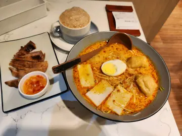 二訪灣仔「坡椰坡囉咪」,依間餐廳果然係區內人氣小店吖,去到晚上8點,依然座無虛席,需要排一陣間隊,不過店員好快已經安排到入座,另外,店員好有禮貌,服務好好,因為已經過了餐廳關門時間,但我仍然未食完所有食品,所以店員細心地免費提供了一些外賣包裝俾我,仲親自幫我入好食品、飲品,非常窩心。馬來肉骨茶套餐配椰漿飯及油條(單點$78),黑湯肉骨茶飲落藥材味道濃郁,但不苦,因為加入了桂圓、杞子去熬煮,所以飲落帶點甘甜;一字排肉質軟腍,食落好入味,配以辣椒黑醬油食用,味道正宗;冬菇食落好Juicy,配菜包括有生菜、油條;椰漿飯,口感軟硬適中,椰漿味道淡香。福建蝦湯麵摻摻(單點$75),海蝦好大隻,肉質彈牙,味道鮮甜;豬油渣食落油脂味濃,摻摻採用米粉、油麵製作,口感好豐富;略嫌湯頭味道較淡,但勝在飲落有鮮味,配料包括有烚蛋、生菜。馬拉盞炒菜(單點$62),表面鋪滿炸蒜、蒜蓉、辣椒,通菜口感爽嫩,食落好惹味。蒜香雞翼(單點$60),即叫即炸,雞翼肉味濃香,雖然在整碟雞翼裏看不到太多蒜蓉,但因為在醃雞翼時加入了大量蒜蓉醃製,所以蒜香味重,食落好香口。凍爆泡拉茶(跟餐$15),手拉拉茶,泡沫口感細密,淡奶比例多,飲落口感幼滑,茶味濃香。凍椰奶咖啡(跟餐$9),採用椰奶、椰子糖漿製作,味道清甜。…查看更多