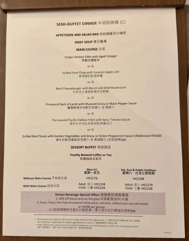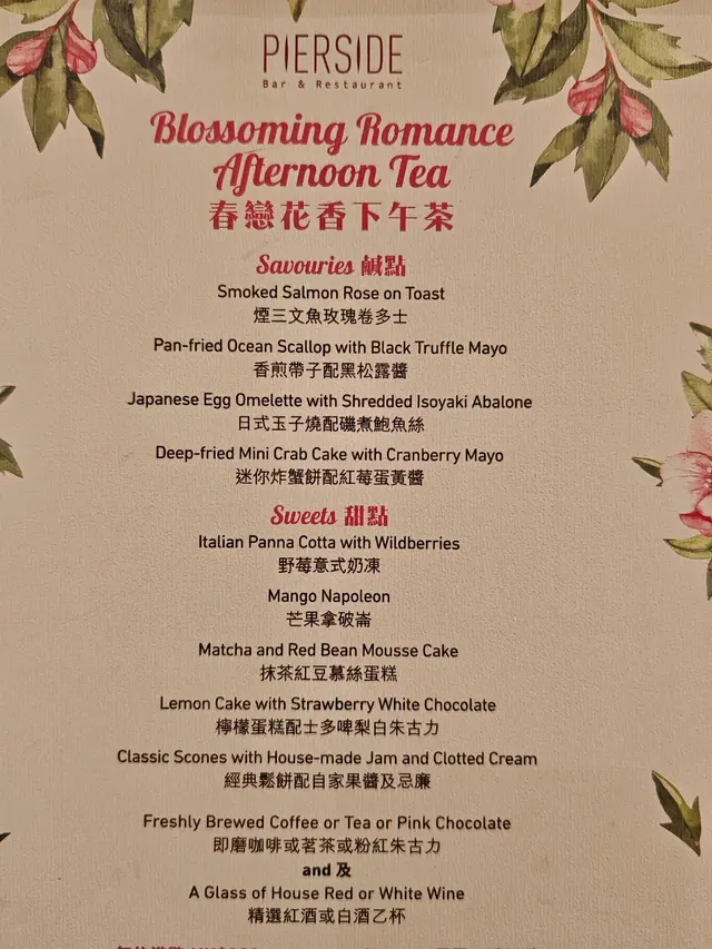 又有好康介紹給大家一套Afternoon Tea有精油擴香瓶贈品送仲可以有酒飲,大家認為要多少錢一位才叫性價比高呢?先賣個關子大家看完整篇文章就會有答案。地點是久別重逢的皇家太平洋酒店 Pierside Bar & Restaurant !餐廳全是落地玻璃陽光透射入去環境非常舒服。這次要來品嚐是皇家太平洋酒店 x Ignite Candle呈獻的芳香果韻下午茶,下午茶份量不少會吃得非常滿足。最吸引我的肯定是下午茶可以選House Wine!喜歡輕談淺酌的朋友感覺更加著數。不嗜酒的朋友更可加錢享用清爽的氣泡茶!下午茶的客人可以用超優惠價$98/2瓶享受原價$88/瓶的氣泡茶,在這個炎炎夏日絕對是不錯的選擇。四款鹹點都非常美味而且挺為大件滿足感爆棚。巴馬火腿哈蜜瓜!清甜哈密瓜配襯鹹香風乾火腿肯定是不敗組合,第一件品嚐它必定沒揀錯。香煎帶子配辣味脆片!鮮嫩的帶子煎得非常香口,配搭微辣的脆片口感更豐盛迷人。炸雞肉棒棒配野莓醬!炸得金黃香脆一點也不油膩,沾些野莓醬一同品嚐提升味道之餘更可解膩是Perfect Match。焗芝士吞拿魚沙律牛角酥!酥香的牛角包內塗滿了細滑的吞拿魚沙律,加上卜卜脆的飛魚籽味道和口感也非常美滿。四款甜點亦色彩繽紛非常養眼,配搭英式鬆餅應該足夠能令甜迷滿意。蜜糖鬆餅可自由配搭Clotted Cream、香橙及士多啤梨果醬!吃下去就是鬆化香甜和澱粉質的滿足。芒果拿破崙!薄脆鬆化酥皮間夾著香滑的吉士忌廉,面層鋪滿香甜新鮮的芒果肉,一口吃下果香滿盈甜美可人震撼味蕾。百香果泡芙!酥脆的外皮內盡是酸香細膩的百香果餡料,味道甜中帶酸是吃罷令人會心微笑的小甜點。番石榴瑪斯卡邦芝士蛋糕!幼滑的芝士蛋糕加入了番石榴的獨特香氣變得格外清新,一件吃吧也沒有甜膩的感覺。荔枝乳酪杯!帶微酸的乳酪跟香甜荔枝碰撞誘發出精彩的香甜滋味,喜歡荔枝味道的朋友不容錯過喔。現在每兩位惠顧下午茶即可免費獲贈Ignite Candle「有機精油擴香瓶」乙份(價值港幣$280),不過數量有限送完即止想要的朋友快快訂座喇。芳香果韻下午茶原價$268/位(+10%)由即日起至9月30日供應,於酒店官網預訂及繳付全費可享快閃7折優惠只需$187.6/位(+10%)。…查看更多