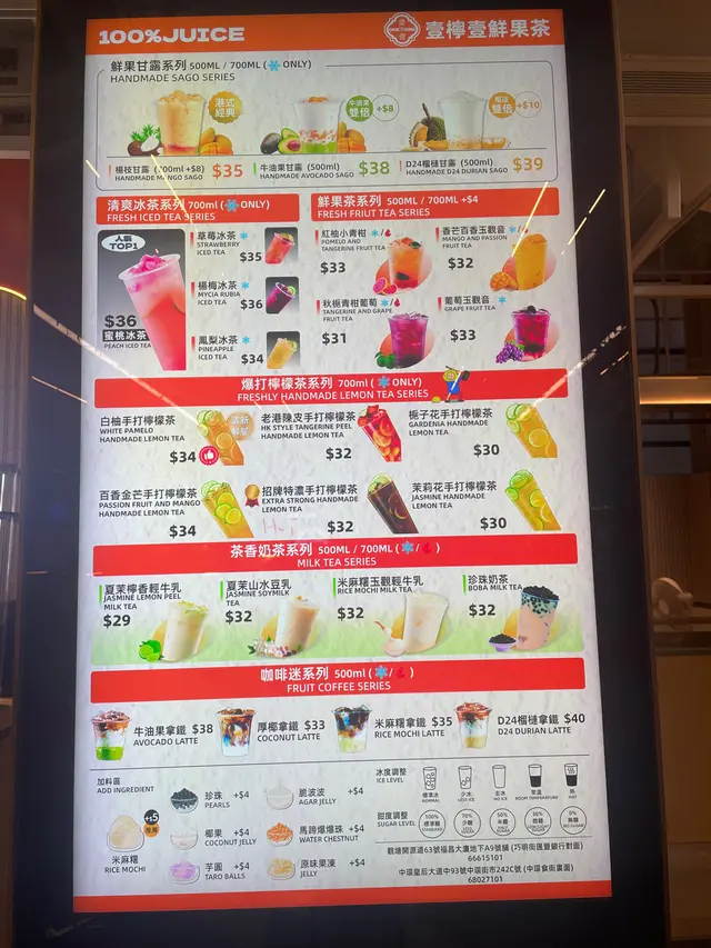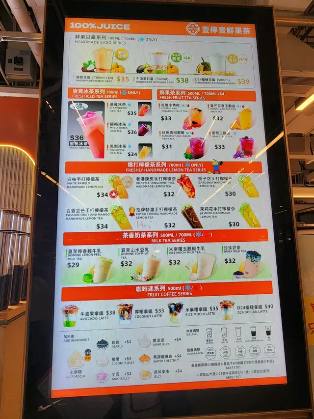 壹檸壹鮮果茶 (中環) 網址: https://s.openrice.com/QrbS03F4C00 地址: 香港中環皇后大道中93號中環街市2樓242C號舖 電話: +852 68027101