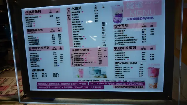 The first time I came across Tea One, it was located in Kwai Chung Plaza. But then it closed like so many eateries in that mall. But then while boyfriend and I were walking around this shopping plaza filled with small eats, we  found out that Tea One had moved here.Menu is in Chinese only. There is no English and no 10% service charge. A small take away shop, it serves various types of bubble tea and fruit based teas and smoothies. But the one thing we found interesting in the Kwai Chung Plaza one was you can choose cake and have it blended into your drink. And that's what we did. A cake blended milk tea ($26).  This made the drink super thick with the addition of cake. However, unlike the one in Kwai Chung, the taste here wasn't as strong. It was a bit on weak side and not as sweet. They did add a lot of cake so it was super thick. A bit too thick for my liking. Unsure if I'd order it again but boyfriend liked it enough查看更多
