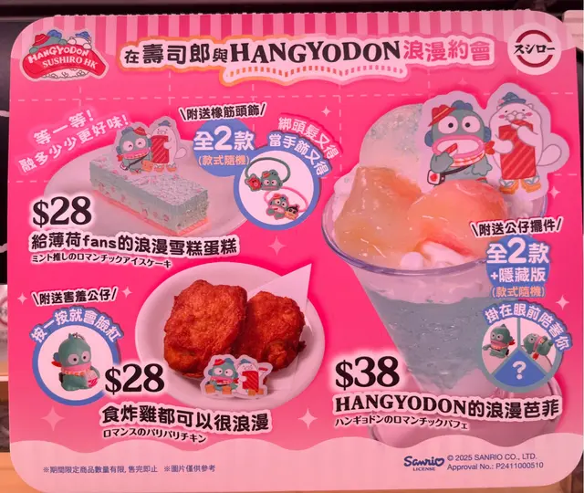 3月壽司郎聯乘Hangyodon🌸薄荷之友必試甜品今次去咗壽司郎大埔店,可能因為係平日夜晚,所以等咗半個鐘已經可以入座。一入到嚟梗係叫咗水怪餐牌嘅食物先啦叫咗個炸雞($28)送咗個害羞公仔,真係會面紅☺️cute兩件雞炸粉均勻,冇雪藏味,調味唔會好濃,小朋友都可以食到。當然都有叫其他壽司食,全部都保持到水準,最抵係$12/3件增量版沙律軍艦(吞拿魚沙律軍艦,粟米沙律軍艦,蟹柳沙律軍艦)到最尾,就係薄荷之友的福了,可以食到薄荷蛋糕($28)又可以有水怪橡筋頭飾(我一開始以為佢冇俾我,原來係放咗喺碟底😆)。件蛋糕入面有啲脆米增加口感同埋唔係薄荷牙膏嗰隻味,食落係有淡淡嘅薄荷味又有少少波子汽水味咁,食完之後個口涼涼哋,幾清新❣️ 呢個可以推薦俾想試薄荷同唔鍾意食薄荷牙膏味嘅朋友仔😉Joyfoodstop心動值: 💓💓💓💓/5壽司郎 (大埔超級城B區)(香港)地址: 香港大埔安邦路8&10號大埔超級城B區1樓128號舖電話: +852 26631108#hongkong#joyfoodstop#taipo#sushi#sushiro#壽司郎#大埔餐廳#hangyodon#水怪#sanrio#March#goodfood#joy…查看更多
