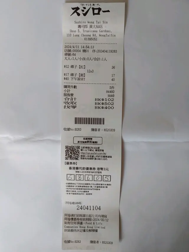 壽司郎 (翔盈里) (黃大仙) 網址: https://s.openrice.com/QrbS0uIqA00 地址: 香港黃大仙龍翔道110號豪苑G3樓翔盈里5號舖 電話: +852 61395051