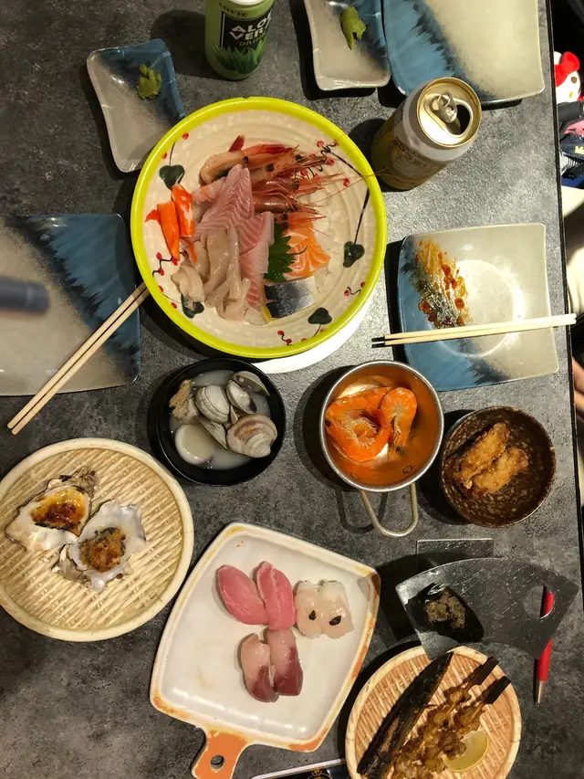 在葵芳地鐵站附近逛完街,順便來這裡吃放題。先點了刺身跟壽司。刺身很新鮮!三文魚、希靈魚、立魚、八爪魚、螺、象拔蚌、墨魚、甜蝦,全部都新鮮。特別是甜蝦和螺,很鮮甜。黑松露帶子壽司、中拖羅壽司、虎蝦壽司、油甘魚壽司和花之戀壽司都非常好。刺身又厚又新鮮,酢飯偏小,和刺身一起吃剛剛好。熟食方便,蒜香燒蠔和黃金燒蠔很推薦。蒜香燒蠔上面鋪了厚厚的蒜茸,和鮮甜的蠔一起燒得剛剛好,蠔汁跟蒜茸令人非常滿足。黃金燒蠔是芝士。燒得溶化的芝士,跟蠔一起吃也味道豐富、口感滿足。.甜品的蕉糖藍海塩雪糕很特別!藍色的雪糕看起來很夢幻,吃下來鹹味跟甜味互配,兩種味道都很突出!這裡交通方便,環境乾淨、舒服;服務也很好,不漏單,又上菜快,整體很好。查看更多