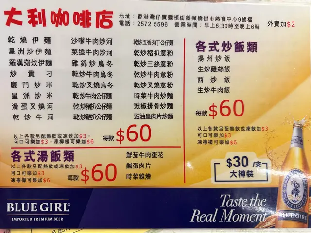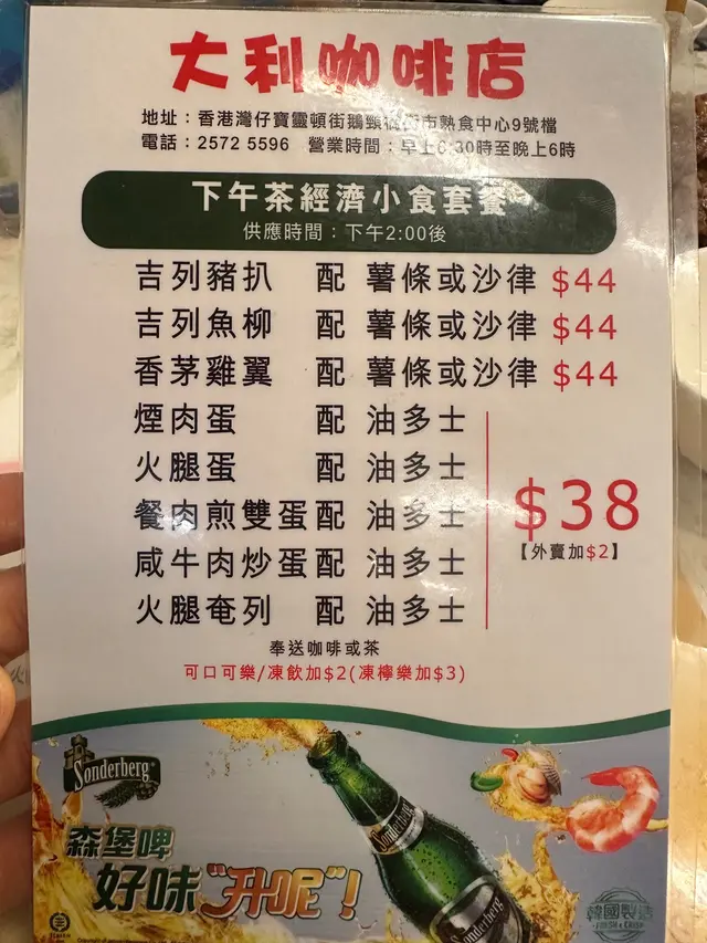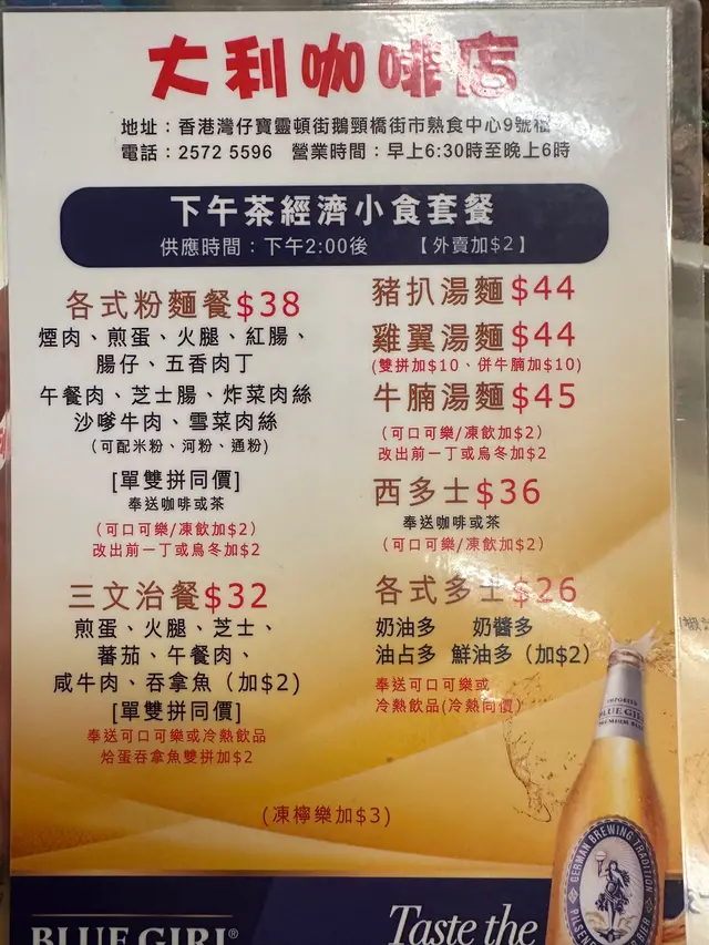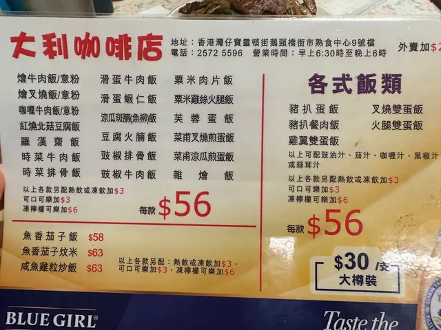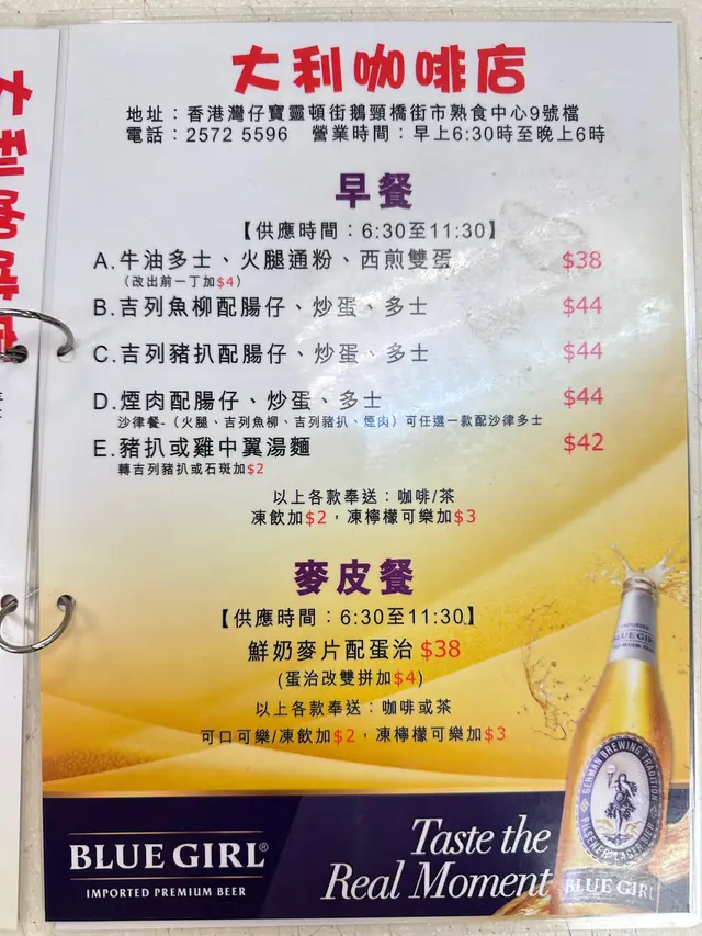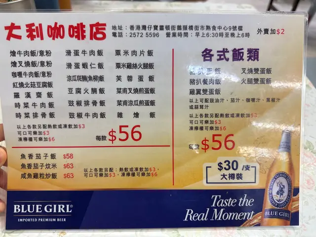 大利咖啡店 (灣仔) 網址: https://s.openrice.com/QrbS0I5a000 地址: 香港灣仔寶靈頓道21號鵝頸街市1樓鵝頸熟食中心 電話: +852 25725596