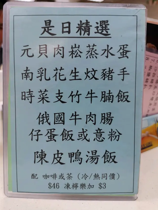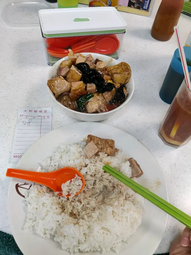 呢日食晏時間嚟到灣仔鵝頸熟食中心搵食。位於鵝頸街市一樓嘅熟食中心上面都有好幾間食肆選擇,今次就揀咗呢間《大利咖啡店》。揀左個是日精選入面嘅時菜支竹牛腩飯配凍檸茶,共$46。時菜支竹牛腩飯,飯同餸分開餐具載,飯夠曬大碟,軟硬適中。時菜支竹牛腩,份量都幾多,牛腩、牛筋、支竹同菜心,大大一碗。牛腩同牛筋都夠腍夠入味,雖然菜心放喺碗底,但都保持到翠綠,冇話焗到黄曬。凍檸茶,茶味同檸檬味都夠濃,味道唔錯。總括嚟講,呢餐食物份量都幾大份,味道唔錯,價錢喺灣仔及銅鑼灣嚟講算平,絕對係一個平靚正嘅好選擇。查看更多