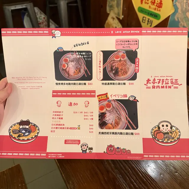 Went to this ramen resto at D2 Place Two for dinner with my colleagues after having gelato. .I ordered the Slow-cooked Hakata Chicken Breast Ramen with Chicken White Soup. It included Hakata chicken breast, soy bamboo shoots, soy soft-boiled egg, onions and plenty of scallions. The soup was clearer compared to the beef bone soup, yet still quite rich, and the chicken breast was thick. Appreciated the runny yolk of the soft-boiled egg. My colleagues ordered Seared Iberico Pork Belly Ramen with Wagyu Beef Bone Soup and Slow-cooked Hakata Chicken Breast Ramen with Wagyu Beef Bone Soup respectively. They mentioned that the soup was quite heavy and greasy, making it hard for them to finish the ramen. Their ramen included shredded black fungus as well. We also ordered Okonomiyaki Style Pan-fried Pork Meat Dumplings to share. Topped with Bonito flakes, seaweed flakes and salad dressing, the dumplings were mouthful and savoury. .The resto was having a collaboration with SpongeBob at that time, selling SpongeBob-related food and merchandise (although I didnt buy lol). .The resto is decorated with a wide array of Japanese/anime posters, figures, decorations, stickers, etc., making it look cute. It even has its own Ojisan logo to match the name of the resto. …查看更多