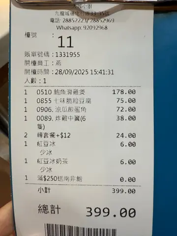 從啟德體育園逛完街,肚子餓得咕咕叫😅 由於剛回港的朋友仔特別想念正宗港式滋味,我們便直奔九龍城人氣茶餐廳「大城小廚」。餐廳位置便利,深受九龍城居民喜愛,菜式經濟實惠,份量十足,美味又抵食,難怪總是很熱鬧!現正推出優惠:堂食滿$250即贈南非鮑魚一隻!酒香冰鎮南非鮑魚彈牙入味,令人回味無窮😋 必點菜式首推[鮑魚滑雞煲]一大煲熱騰騰上桌,鮑魚鮮嫩彈牙,雞件軟嫩多汁,醬汁濃郁惹味,配飯絕對一流!另一道下飯神菜是[涼瓜煎蛋角]苦瓜清新不苦,搭配厚實香煎的蛋角,口感豐富,份量超滿足![七味脆粒豆腐]外脆內嫩,豆香濃郁,灑上微辣七味粉,風味十足,想再添辣香可蘸點餐廳自製辣椒油,滋味倍增!還有6隻香脆多汁的[炸雞中翼],僅售$38,性價比超高,絕對抵食!另外,加$12就可轉成套餐,有飯有飲品。紅豆冰、紅豆冰奶茶都不錯~...φφ… 𝓦𝓮 𝓸𝓻𝓭𝓮𝓻𝓮𝓭 ...φφ…鮑魚滑雞煲 $178七味脆粒豆腐 $75涼瓜煎蛋角 $72炸雞中翼 $38/ 6隻轉套餐 +$12/ 位.....….....….....….....….....………..…查看更多