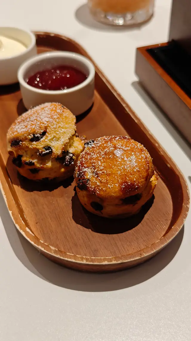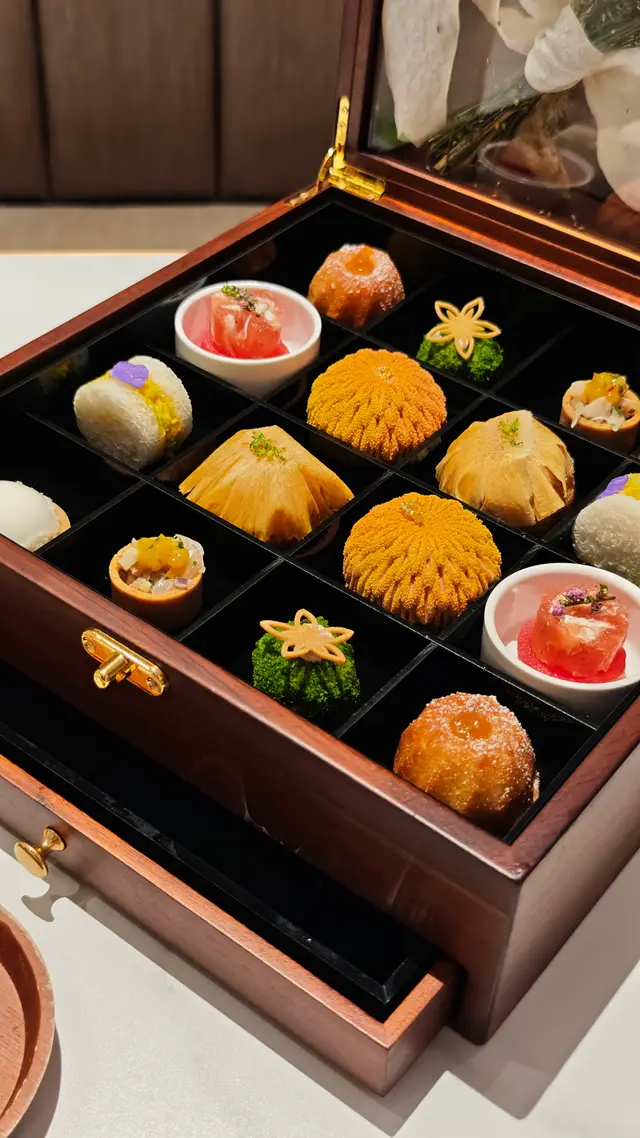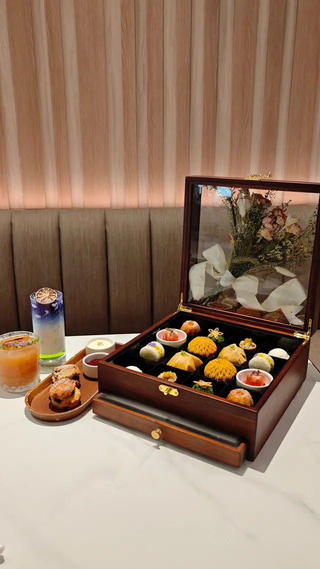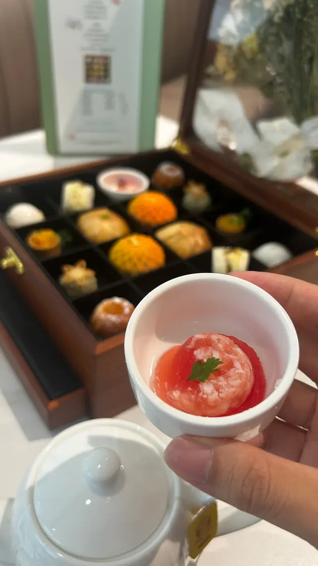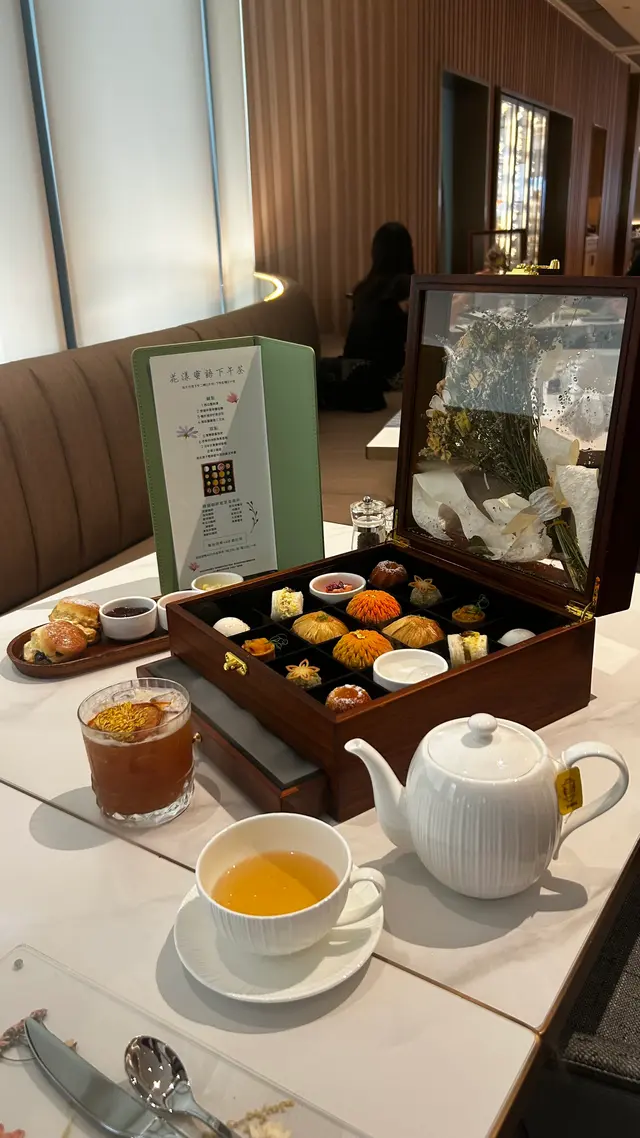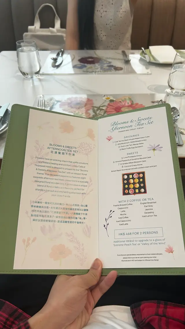 認識我的朋友都知我喜歡花,特意告訴我合和酒店大堂咖啡廳Lobby Cafe 正推出以花卉為主題的「花漾蜜語下午茶」,再配兩杯特色飲品(桃之茶或風之谷),好優雅.八款精緻的鹹甜美點整齊放在特製的花漾盒子內,店員放下盒子並把橙花水注入木盒底層的乾冰中,多重感官享受,很有氣氛. 雲霧繚繞,幾浪漫~ 下午茶共有以四款水果打造的甜點及四款鹹點. 盒子正中間的四件大大的, 分別是青檸菠蘿泡芙及杏香奶油熱情果蛋糕. 泡芙非常真材實料! 以薄菠蘿乾片放在泡芙上, 一咬下已經微酸甜, 餡料是滿滿的青檸和菠蘿蓉, 清酸有度, 大愛~ 杏香奶油熱情果蛋糕如日本和菓子般, 造型已經好靚. 絲滑的杏仁慕絲和熱情果甘納, 配鬆軟的海綿蛋糕, 甜度剛剛好, 更是齒頰留香. 以為這只是平平無奇的蛋糕, 咬下就知是日本甘夏蜜柑蛋糕, 那份甘橘香氣從橙花果醬中滲出, 是輕盈不膩. 同樣不膩而香香的是椰子脆餅. 幼滑的椰子幕絲, 香氣淡雅, 夾層的烤果仁糖充滿堅果香, 是平凡之中的亮點. 咸點之中, 我最喜歡慢煮帶子撻, 因為有柚子及芒果莎莎, 是酸甜的交織. 賣相有點像生豬肉的西瓜蟹肉凍, 超多蟹肉在多汁的西瓜襯托下, 原來甜美更突出. 燒咖喱雞肉三文治幾香口, 麵包是鬆軟不硬, 這點值得一讚. 喜歡吃黑松露的話, 這件菌方塊伴羽衣甘藍麵包糠絕對不會讓你失望. 菌慕絲之中還有軟滑芝士, 幾creamy. 最後, 不忘英式提子鬆餅配香滑忌廉及果醬, 真的太飽, 只是到半件. 花漾蜜語下午茶, HK$ 468 元/兩位用,包括兩杯精選咖啡或茗茶,另加HK$ 40 元升級享用一杯特色飲品桃之茶或風之谷。 桃之茶 - 特調伯爵茶與茉莉花茶調和而成的茶底,加入蜜桃果蓉、橙汁及檸檬汁,清新脫俗. 風之谷 – 如畫般美, 猶如藍天白雲與小草地, 以蜜瓜及青蘋果糖漿、乳酪與蝶豆花牛奶調成, 味道豐富多層次. 花漾蜜語下午茶於 2025 年 9 月 22 日至 12 月 30 日,每日下午 2 :30PM-5:30PM供應。…查看更多