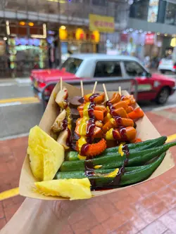 旺角B2口出来,每次必点「大大皇牌combo」:鲜鲍鱼、大墨鱼、超大生肠、火鸡肾、秋葵……均价仅11港币。最爱那颗鲜鲍鱼,卤得透而不烂,Q弹紧实,一口爆香。酱料必须加全——甜酱提味,椰香沙爹增香,黄芥末酱才是灵魂,冲劲直冲天灵盖,辣中带醒,吃过就忘不掉。堂食还会附赠两片超甜菠萝,吃完串串来一口,清口解腻,堪称神来之笔。最安心的是,每一串都处理得极其干净,食材新鲜,毫无腥臊,连内脏都吃得毫不迟疑。看看门口排的队,基本都是本地人,跟着吃准没错。查看更多