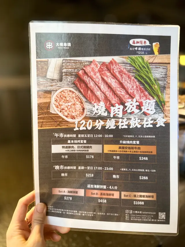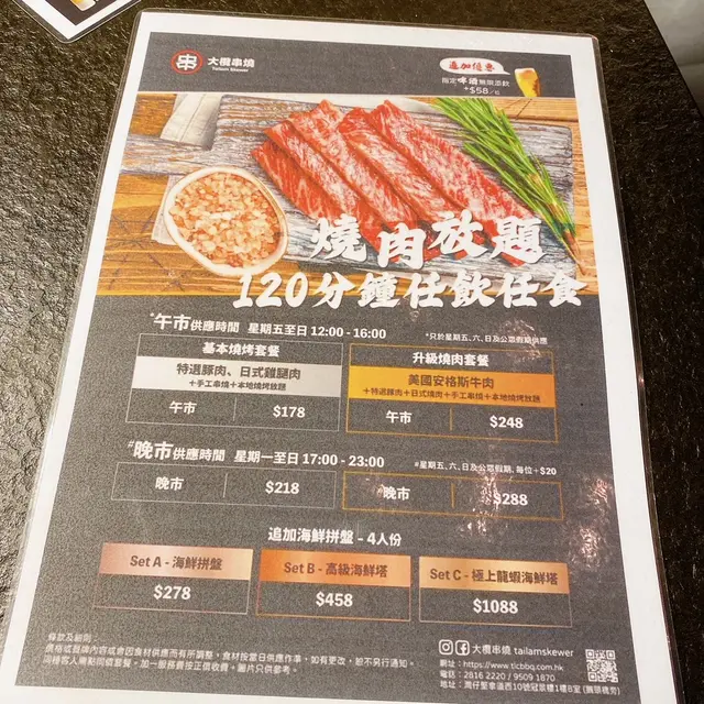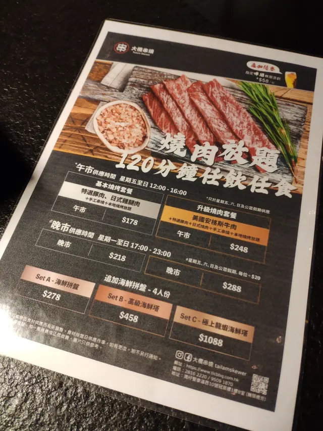 一開始看店名還以為是在元朗的大欖ʙʙǫ,原來是在銅鑼灣的串燒放題,而且是要親自落手燒的串燒,跟平時的燒肉有點不同,燒得好與否就要靠個人技巧了🤭⤫ ⤫ ⤫ ⤫ ⤫ ⤫ ⤫ ⤫ ⤫ ⤫<升級燒肉套餐> $288/ᴘᴘ120分鐘的任飲任食燒肉放題,跟平時燒肉不同,是以串燒形式燒烤,可以自行到外面的雪櫃取食物,肉類、丸類及蔬菜串燒都預先串好!跟基本燒肉套餐的主要分別是多了牛及羊的燒肉,個人覺得性價比也不錯!燒烤爐的火力充足,所以有足夠時間燒到多ʀᴏᴜɴᴅ,肉類及丸類串燒比想像中高質,台式花枝丸有粒粒花枝肉,芝味牛筋丸彈牙多汁,土匪雞翼是必吃,拿了好幾回來燒,燒到黃金色的雞翼皮脆內嫩🐥ดูเพิ่มเติม