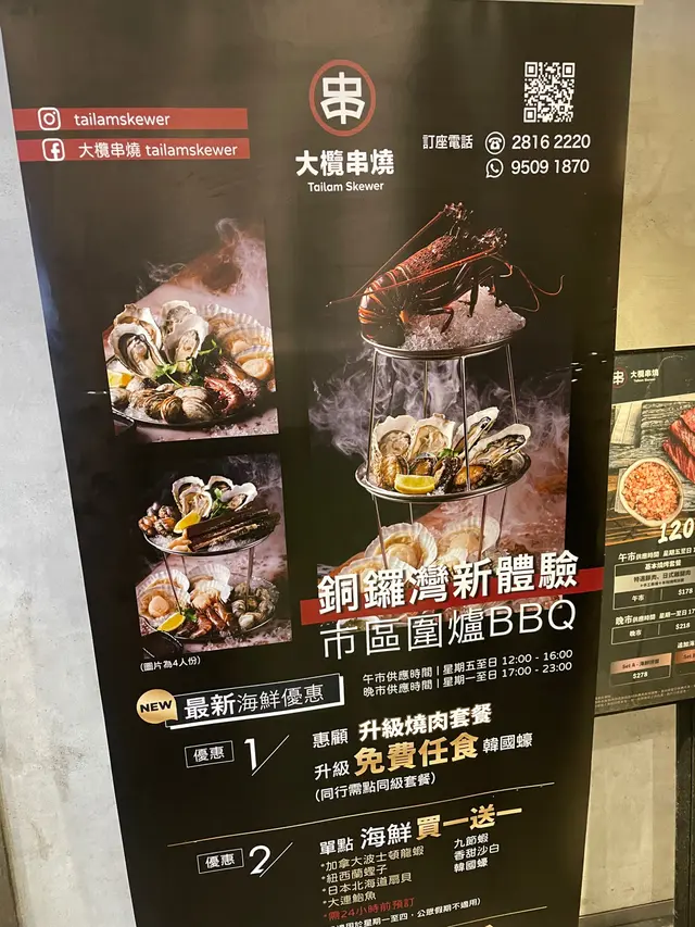 升級燒肉套餐*Time : Mar 2023, Dinner Time*Price : $288 -HKD /人+1088海鮮盤*Place : 大欖串燒*Review : 大欖串燒不在大欖,反而在銅鑼灣,影完相吃放題食過夠。- 海鮮盤 :外加1088,龍蝦,凡立貝,蟶子等,份量是不小,味道不過不失- 串燒肉 :有雞有豬,超過20種,當中比較出色的是豬頸肉- 龍蝦 :就是海鮮盤的龍蝦,店員會幫你焗熟,肉是很厚,不過有點咸整體是普通,海鮮盤比較貴,倒是升級的套餐有日本蠔有和牛,一定食得飽大欖串燒地址 :銅鑼灣堅拿道西10號冠景樓1樓B室ดูเพิ่มเติม