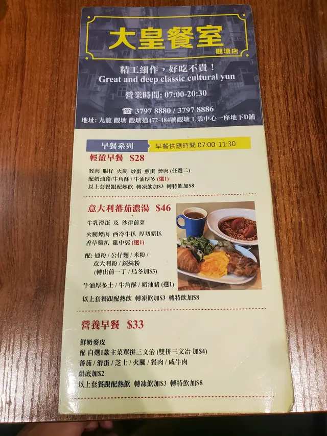 大皇餐室 (觀塘) 網址: https://s.openrice.com/QrbS0LrqD00 地址: 香港觀塘觀塘道472-484號觀塘工業中心一期地下D號舖 電話: +852 37978880