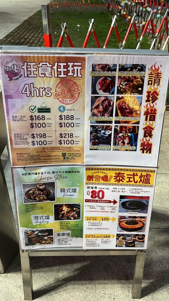 位於大埔汀角路17-29地段的大美督嘉年華燒烤,是以玩樂場+BBQ作招徠的燒烤場,深受家庭親子歡迎。餐廳標榜任玩任食燒烤,甫進門口,有泰式爐、韓式爐、港式爐、重慶爐四爐選擇,夠多元化。起爐費用為60元。198元/人,三小時任食,配套包括原樽蜜糖、孜然粉、辣粉、豉油醬料(在食材店自取)、紙巾一包。每人可有兩支飲品。🍖 美食任你選,超過50款醃製食材這裡提供超過50款不加味精的醃製食材,包括香辣火腎、蒜香雞全翼、黑椒牛仔粒、土匪雞中翼、香草雞中翼、燒汁牛扒等等,燒起來香噴噴,扒類食物夠juicy。此外,還有無限添加的孜然粉、辣粉和豉油,讓你自由調味,享受個人化的燒烤體驗。丸類和蔬菜款式亦很多,韭菜、茄子、冬菰、洋蔥等等。🌿 娛樂配套豐富對於小朋友來說,這裡的遊玩設施挺豐富,有彈跳床,甚至嬉水池;對大人來說,特別是喜歡音樂的人,可以唱K/點歌,有八九十年代的經典粵語流行曲,也有近年熱播的金曲。…查看更多