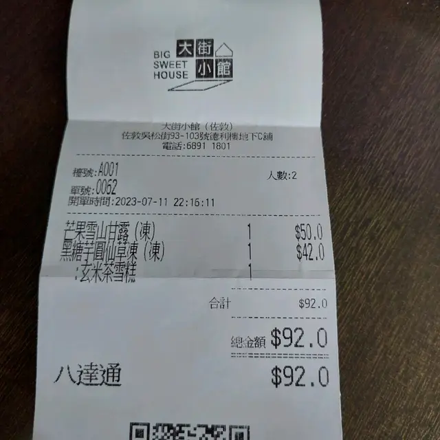 今日喺佐敦同朋友食完飯, 大家意猶未盡, 決定去食糖水再續. 又係open rice 出動. 搵到間" 大街小館" D 相都好似唔錯. 就決定去試一試睇下伏唔伏啦. 食完飯都已經晚上10點啦. 行左5分鐘去到吳松街我都已經有D出汗. 呢D天氣真係悶熱到叫唔好唔好.  去到門口見到佢地生意都好好全鋪滿坐. 只好攞飛排隊. 幸好係第二張. 等左5分鐘左右有位. 都好快有位好在. 由於太熱. 我在等位睇門口MENU時已經決定食冰降降溫. 一坐低即點左1)芒果雪山甘露-  綿綿冰做得非常好. 食落軟綿順滑. 芒果肉好多. 小丸子好咬口. 超降溫, 好好食無揀錯. 2)黑糖芋圓仙草凍 ( 仲可揀配- 一球芋泥OR一球雪糕 ) 最後朋友揀左配雪糕- 玄米茶味. - 超足料, 芋圓有成10幾粒好煙韌好有咬口,唔會死實實. 仙草凍好軟滑. 玄米茶味雪糕有好濃濃嘅茶味. 兩個甜品都好好食. 無伏仲會再番食. 查看更多
