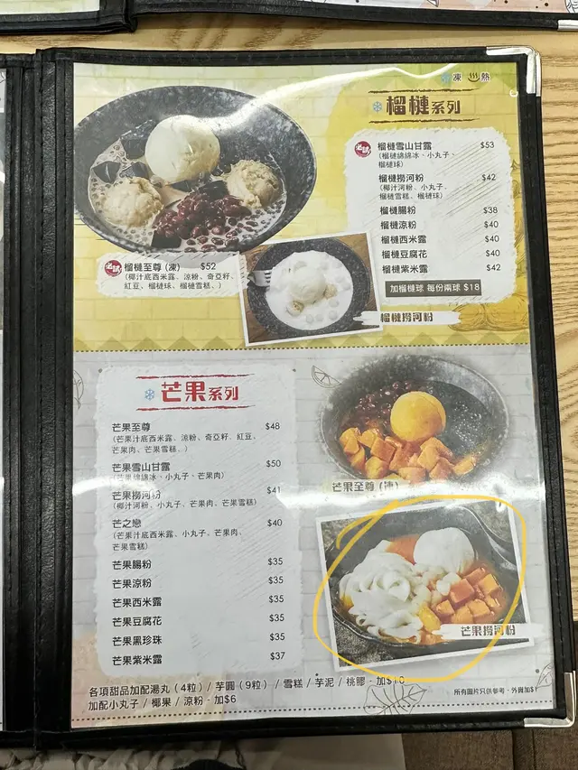 26/10/2023 星期四 晚上8時30分食完飯諗住搵間正三常常嘅甜品鋪去食下,見到笑笑:):)有百幾個,內心就諗應該唔會伏得去邊,點知完全係一個大伏嘅餐廳:(:(叫咗一個 芒之戀$40 同 一個 芒果雪山甘露$50真係好伏,食依間敬請三思。芒之戀$40 (芒果汁底西米露,小丸子,芒果肉,芒果雪糕)成碗嘢唔知點解仲可以繼續賣比客人食,小丸子可以淋到係芝麻糊咁,完完全全無咬口,淋到可以用條脷輕輕力lam爛哂。芒果如圖中所見,全部都係熟到黑色🤮🤢,仲要係成酸酸地🤢🤮,咁都可以賣比客食,面皮厚都係一種本事。個芒果汁底稀到可以無味仲要係唔凍😓😓,加埋一齊食,得個芒果雪糕係正常。邊有食西米露食唔夠凍嘅。芒果雪山甘露$50 (芒果綿綿冰,小丸子,芒果肉)小丸子又喺淋到泥漿咁嘅樣,芒果都喺熟到又黑又淋咁😰😨😫,綿綿冰都可以無乜芒果味😰。迫我喺人生中寫嘅第二個負評的餐廳,唔係我要求高,如果大家要試伏,我都阻止唔到。如果大家要揀依間餐廳既話,真係要三思:(。其他食物我唔清楚,但連最基本嘅芒果都可以整成咁,其他我諗好食極有限🤮🤮。查看更多