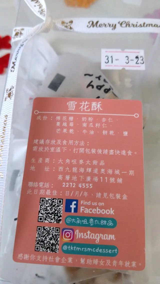 在2022年聖誕節,平安夜當日,我跟兩位好姊妹,一起租住天水圍嘉湖海逸酒店 Christmas staycation!其中一位好姊妹好客氣,送上購自奧海城 <大角咀麥太甜品> 出品的雪花酥! 多謝她的心意!這間甜品店對我來說絕不陌生,記得4年前,跟那位貪心自私的前度男友來幫襯,當我請他食什麼都好,他總喜歡選擇最貴的美食!其實!我都懷疑究竟他對那些較貴的美食有冇興趣或者是否啱自己口味呢?當時,我請他來這裡食甜品,之所以,我覺得這裡的甜品唔抵食!大家可看看 2019/1/6 我的食評雪花酥一盒8粒,以可愛精緻的動物圖案獨立包裝!成份:棉花糖、奶粉、杏仁、蔓越莓、南瓜籽仁、芒果乾 、牛油、餅乾、鹽。雪花酥入口帶鬆化,夾雜堅果及果乾,增添口感!反而,媽咪覺得跟鳥結糖有點相似!查看更多