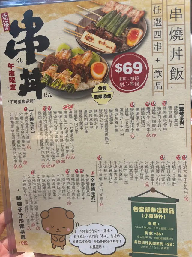 難得自己一個人放假,可以試吓新嘢,呢間中午"串丼"$70蚊有找,4串自選串燒仲有半隻蛋,加埋嘢飲,自己再加個小食咁,串燒有4串,真係即叫即燒,幾新鮮,吉列好脆,唔係翻炸,好味! 嚟開呢頭可以試吓~查看更多