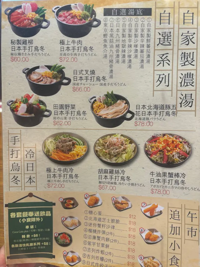 這間小店位於荃灣大壩街,門面不算太顯眼,lunch和同事經過看到午市餐牌很吸引,便入去試一試。店舖不算很大間,裏面的裝修很有日式的感覺,座位舒服乾淨。午市餐牌的選擇有很多,自家製濃湯自選系列可以選一鍋鍋的手打烏冬或拉麵,配各種不同的配料和湯底,食客可因應自己的喜好自由選擇不同的配搭。另外還可以選擇各款串燒配飯,而且可以免費無限添飯。午市套餐還附送汽水,十分抵食。🌟秘製雞柳日本手打烏冬+鮮蕃茄濃湯($60)🌟極上牛肉日本手打烏冬+辛辣蕃茄茄濃湯($66)🌟日式叉燒日本手打烏冬+九州豬骨濃湯 ($72)手打烏冬送上來的時候用鐵鍋盛着,熱騰騰的,而且烏冬的質感很彈牙,各款湯底都十分香濃,配料一點也不馬虎,牛肉、叉燒和雞肉的份量也不少。🌟迷你蟹籽沙律 ($18)午市還可以追加各款小食,我們就選擇了迷你蟹籽沙律,味道不錯,但份量就比較少。這間店的環境、食物質素和份量也不錯,值得一試!查看更多
