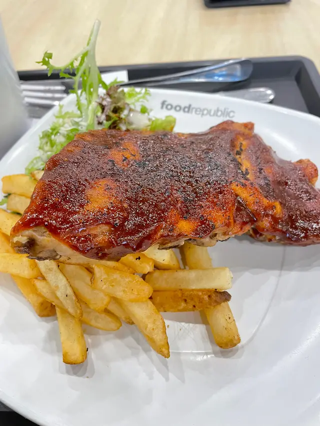 逛完海港城購物後,順道到大食代(Food Republic)解決午餐。這裡是海港城著名的美食廣場,匯聚多間食肆,環境明亮寬敞,適合趕時間的都市人。選了其中一間西式快餐攤的烤排骨套餐,總價$71,包含主菜、薯條和小沙拉,性價比不錯。主菜:烤排骨配薯條