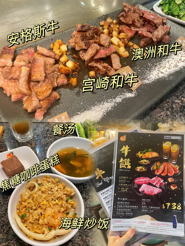 蕞近lunchtime 都是跟同事来大食代吃,主要就是方便快捷选择还多!!👀蕞近工作都挺辛苦的,所以决定犒劳一下自己,虽然是工作餐,但是我们也要吃蕞好的😏🤭大食代真的是高性价比,打工人的爱❤️主要也是看到铁板烧就舍不得走了……太香了,哈喇子直流🤤🤤【牛馔】双人餐有A5宫崎和牛、澳洲和牛、安格斯牛,品质都超好的很新鲜!安崎和牛的雪花纹理绝了,入口满嘴的油脂香😋安格斯瘦一些,也更有嚼劲,吃多少我都不会腻~西京烧比目鱼扒-一整块鱼扒外皮焦香,里面的鱼肉汁水满满,很香很嫩!牛油烧汁阿根廷红虾-红虾还挺大一只的,虾肉肉质紧致弹牙,每一口都很满足😌牛油香煎黑椒鲍鱼-黑椒汁好好吃,鲍鱼嫩且弹牙还有海鲜炒饭,铁板时蔬,餐汤和焦糖咖啡蛋糕,这一顿吃撑了……好丰富!还去隔壁Quenches买了杯茉莉香水柠檬茶和刨冰🍧。柠檬茶口感清爽,刨冰量很足,整体来说还是很不错滴~之前还吃过日式蛋包饭的鸡扒蛋包饭,新开的丼家拉面🍜也都还挺不错的!小辣椒重庆美食的酸辣粉凉拌菜,超nice!!中辣都很辣,好吃😋还有吐司🍞海南🐓烧腊饭、饺子米线啥的,选择很多!!很适合附近的打工人和游客~查看更多