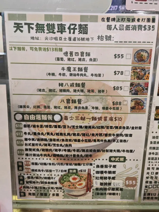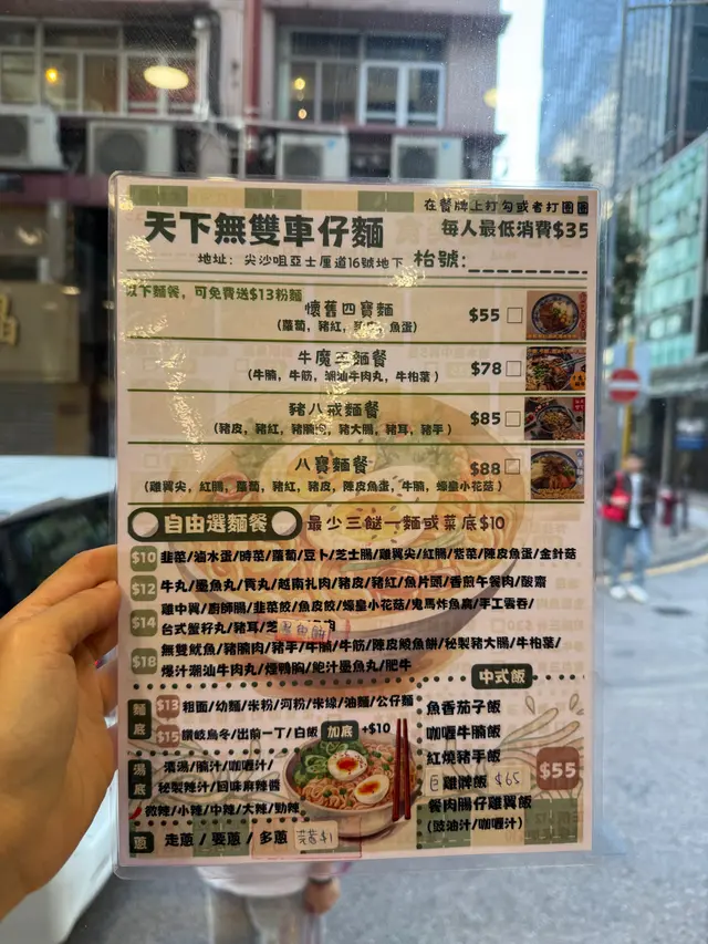 尖沙咀亞士厘道「天下無雙」一入門就感受到濃厚的港式氛圍,環境ok gei,價錢合理,每一樣嘢都係大家好熟悉嘅美食🥰令人倍感親切。樣樣都嘗試😃回憶返晒嚟。牛魔王麵餐這碗麵簡直是牛肉愛好者favourite!牛腩軟嫩,牛筋彈牙,牛栢業的鮮味,再加埋油麵,更是令人讚不絕口,牛丸ok,整體湯底濃郁。有水準嘅車仔麵。懷舊4寶麵蘿蔔清甜,豬紅香滑與豬皮入味。搭配讓人完美,陳皮魚蛋勁正,配搭完美,好食到令人停唔到口!生菜魚肉生菜魚肉讓我瞬間回到童年。就係嗰種街小店魚肉生菜,湯底配有麻油😍就係嗰種風味👍🏻👍🏻👍🏻完全做到全隻炸雞翼全隻炸雞翼而家好難食到😝炸雞翼外脆內嫩,醃製得恰到好處,咬下去的那一刻,香氣四溢,讓人忍不住多點幾隻!飲品咸檸七&凍檸茶當然少不了。清涼解渴;車仔麵好伴侶❤️讓人心情愉悅。餐廳仲有好多唔同嘅地道選擇一定會再嚟,亦都一定推介,所有嘢都好有水準必食必試👍🏻👍🏻👍🏻整體來說,「天下無雙」的餐點不僅味道出色,份量也頗足,絕對值得一試!如果你在尖沙咀附近,不妨來這裡享受一頓美味的港式餐!…查看更多