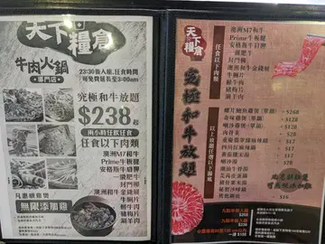作為牛魔王嘅我,今次發現咗一間超級驚喜嘅火鍋放題!「天下糧倉」絕對係肉食愛好者嘅天堂~佢哋主打嘅究極和牛放題,一次過可以試勻8款高質牛肉部位,每款都各有特色,真心推薦!😋 - 🐮必食牛肉部位:✅澳洲M7和牛 - 油花分布超靚,入口即溶,牛味香濃!✅澳洲和牛金錢展 - 口感有層次,肉味濃郁,咬落油脂滲出嚟超香🤤✅鮮牛肉 - 嫩滑唔un,配麻辣湯底一流✅封門柳 - 肉味濃厚,切得薄薄一片,涮完鮮嫩多汁✅安格斯牛肩胛 - 油脂分布勻循,香口又唔會太膩✅牛脷片 - 切得夠薄,涮一涮就食得,口感煙韌帶嚼勁✅一級肥牛 - 肥瘦比例啱啱好,入口即溶✅Prime牛板腱 - 口感煙韌,有咬勁,牛味濃郁 - 🍲雙拼湯底揀咗「招牌牛骨湯」同「麻辣湯」:招牌牛骨湯清香鮮甜,能夠完美帶出牛肉嘅原汁原味,唔使點醬都已經好正✨麻辣湯底香麻惹味,辣度溫和得嚟層次豐富,淥鮮牛肉同牛肚特別夾! - 🥬自助區超豐富:除咗牛肉,仲有海鮮、蔬菜、丸類、餃子、響鈴、銀針粉、烏冬等多款配料任拎任食!特別推薦佢哋嘅川味麻辣餃子,辛香開胃🥟 - 🍨甜品驚喜:最後當然要食埋雪糕完美收尾!佢哋提供多款口味嘅大阪牛乳雪糕同雪葩,我最愛伯爵茶味同香芋味,茶香細膩,味道濃而不甜膩~仲有龜苓膏可以下火❤️ - 🥤飲品任飲:櫃台有齊汽水、無糖茶、韓式飲品、涼茶等,特別發現有款「有氣涼茶」幾特別,涼茶味帶啲汽水feel,打邊爐飲好爽! - 環境方面,座位寬敞,適合同朋友慢慢吹水恰下恰下❤️查看更多