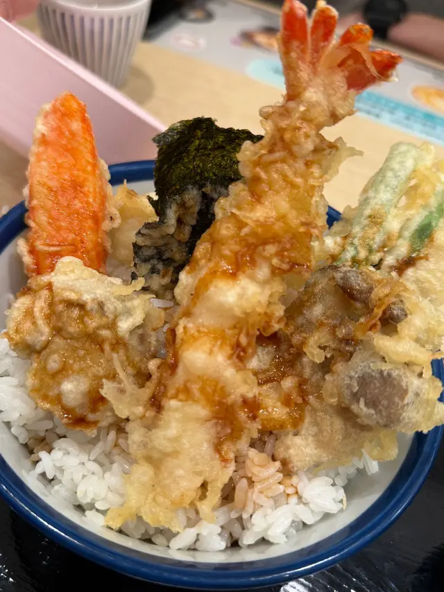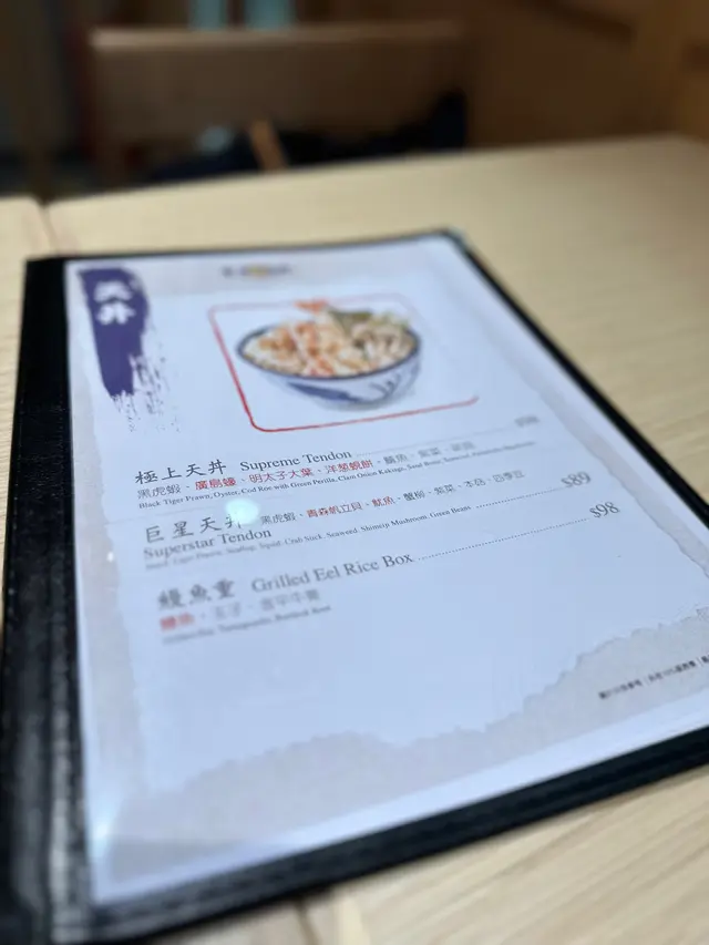 巨星天丼 Superstar Tendon$89 黑虎蝦,青森帆立貝,魷魚,蟹柳,紫菜,本菇,四季豆黑虎蝦外層金黃酥脆咬下去鮮嫩肉質在口中爆發/青森帆立貝的甜味在口中緩緩釋放肉質鮮美柔軟/魷魚的口感彈牙保持了原有的鮮味/紫菜帶有淡淡海味增加刺激/本菇的菌香口感獨特香氣在口中持久回蕩/四季豆同蟹柳普通海の味天丼Occan Tendon黑虎蝦,鰻魚,明太子大葉,洋葱蜆餅,麵魚,紫菜,啡菇查看更多